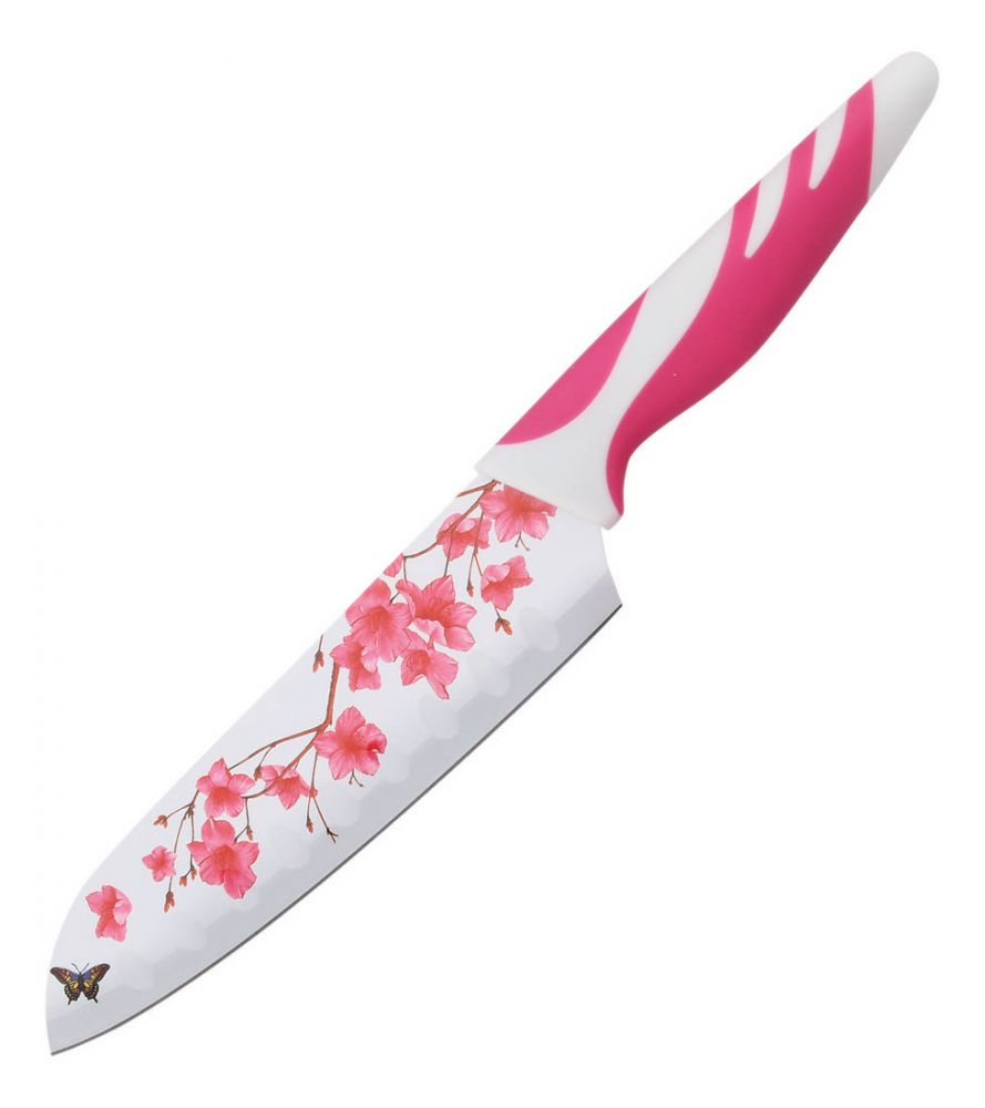 Нож сантоку mal-08cp. Бренд Mallony Страна КИТАЙ Нож окрашенный с рисунком Сакура MAL-08СР (сантоку, большой - универсальный) размер лезвия 17,5 см Сантоку — универсальный японский кухонный нож. Первоначально был разработан как модификация западного (в частности, французского) поварского ножа для разделки говядины, а затем его приспособили для нужд японской кухни. «Сантоку» буквально переводится как «три хороших вещи» или «три вида использования», что говорит о пригодности ножа хорошо резать, рубить и крошить. Размер сантоку удобен для резки мелкими ломтиками или кубиками как мяса, так и овощей. Химически нейтрален, не вступает в химическую реакцию с пищей во время готовки, благодаря покрытию (краска нон-стик) к лезвию значительно меньше прилипают продукты (сыры, хлеб, фрукты, овощи и т.д.). Заточка: подходят любые точилки и оселок. Материалы: нержавеющая сталь, окрашенный, Ручка - пластик , цвет красный с белым/soft-touch (прорезиненная, мягкая). Классический дизайн! Упаковка: блистер.  развернуть описание ▼