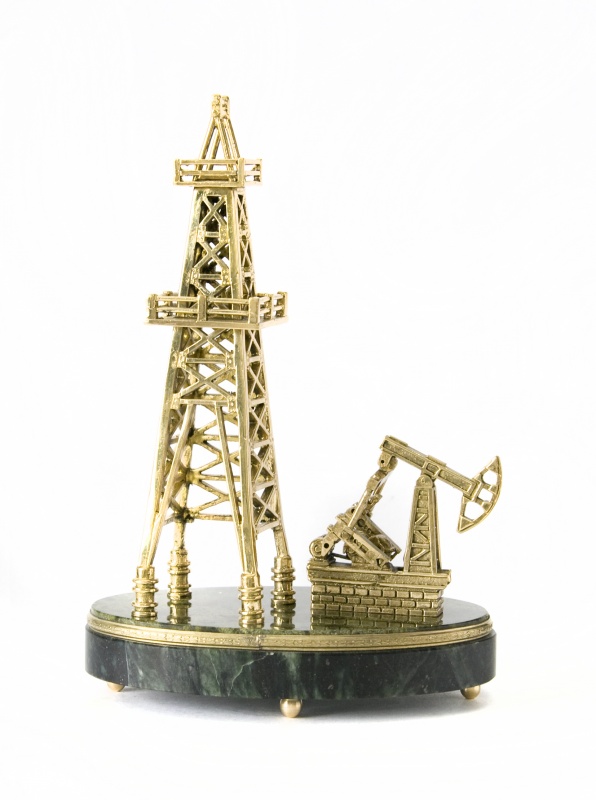 Сувенир "вышка - качалка" подставка змеевик. Материал: змеевик, латунь. Покрытия: золотом 999,9; никелем. Техника исполнения: токарные и слесарные работы, художественное литье, полировка. Потрясающий по своему исполнению сувенир. Нефтяная вышка-качалка из латуни на подставке из змеевика выполнена мастерами вручную. Работа поистине ювелирная, а потому уникальная и эксклюзивная. Без сомнений, это лучший подарок директору нефтяной компании на профессиональный праздник. Композиция выглядит богато, поражает точностью исполнения деталей, красотой и необычностью. Размеры: высота 200 мм. основание диаметр 150 мм. Покрытие Гальванический метод