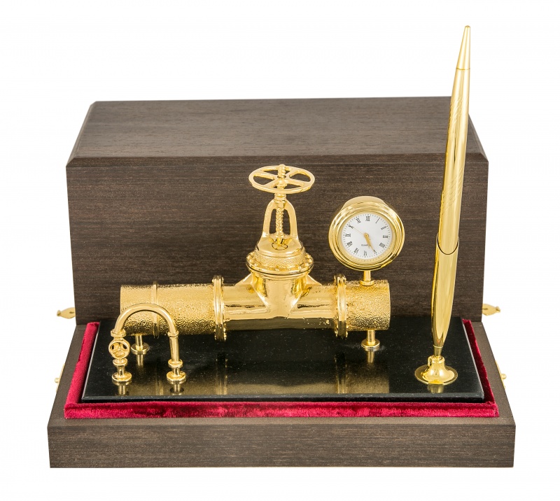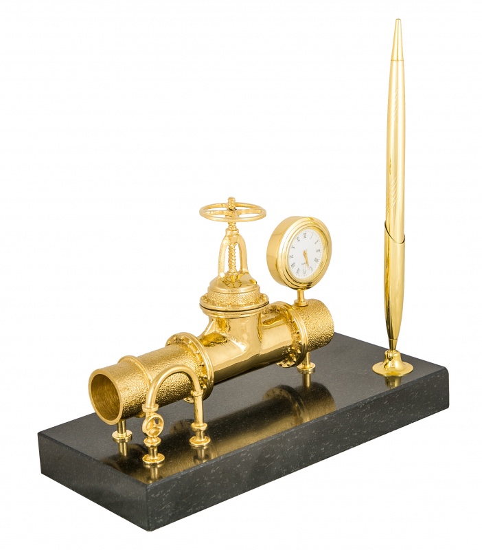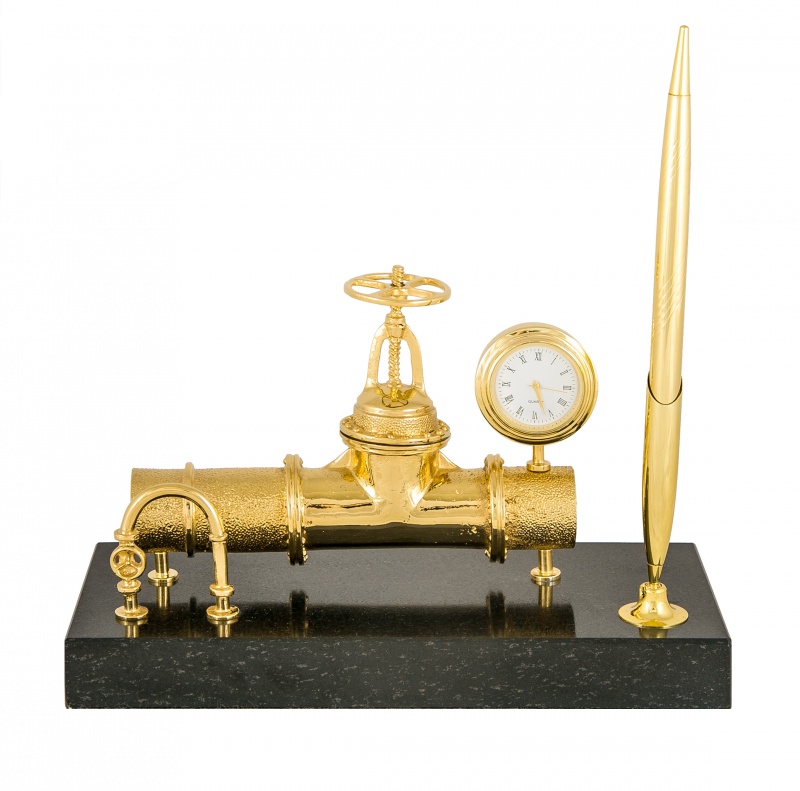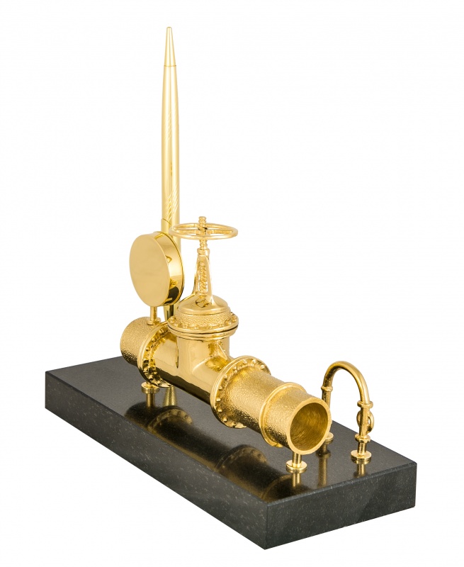 Письменный прибор "труба". Материал: долерит, латунь. Покрытия: золотом 999,9; никелем. Техника исполнения: токарные и слесарные работы, художественное литье, полировка. «Труба» - отличный подарок для представителей тематических профессий. Письменный набор из латуни с золотым напылением идеально впишется в концепцию любого рабочего кабинета и покорит окружающих своим причудливым дизайном. В него входит только все самое необходимое, поэтому такой письменный набор всегда будет востребован своим владельцем! Размеры: высота 130 мм. ширина 200 мм. глубина 90 мм. Покрытие Гальванический метод