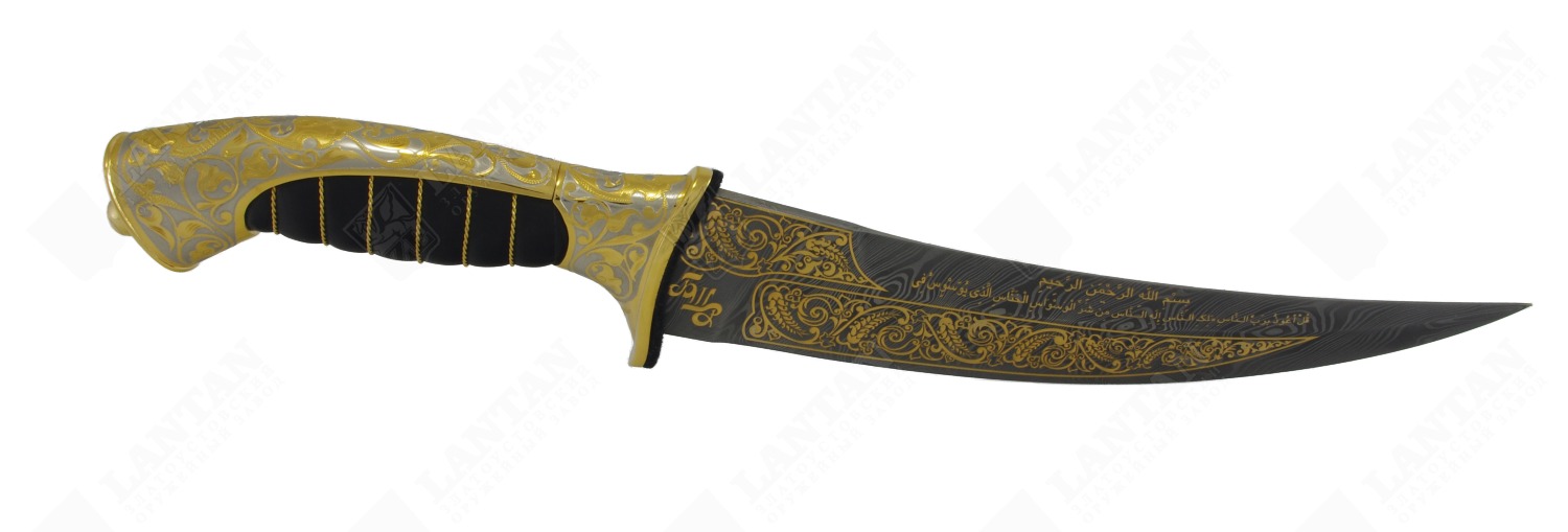 Нож цм "султан" из дамасской стали (закалка 58-62 ед. по шкале р. Материал: клинок из дамасcкой стали (закалка 58-62 ед. по шкале Роквелла); рукоять и ножны из латуни; инкрустация ювелирными камнями. Покрытие: золотом 999,9; никелем. Техника исполнения: токарные и слесарные работы, рисовка кистью на металле, многоступенчатая гравировка иглой по лаку, травление, ручная подрезка, полировка, ювилирное дело. Эксклюзивный и продуманный до мелочей нож цельнометаллический «Султан» изготовлен из дамасской стали, а также латуни. Изделие покрыто золотом и никелем и инкрустировано ювелирными камнями зеленого цвета. Немного изогнутый клинок декорирован сложной гравировкой, что придают ему роскоши и благородства. Нож выполнен в восточном стиле и станет дорогим подарком для изысканных ценителей холодного оружия. ? ×сталь Тип стали Кованая дамасская Покрытие Гальванический метод