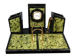 Письменный прибор "бумажница с часами и календарь". Материал: змеевик, латунь. Техника исполнения: токарные и слесарные работы, рисовка кистью на металле, художественное литье, многоступенчатая гравировка иглой по лаку, травление, ручная подрезка, полировка. Набор изготовлен из природных материалов высокого качества. Филигранная проработка деталей характеризует безупречную работу мастера. Изделие станет изысканным статусным подарком для Vip персоны, великолепно впишется в богатый интерьер дома или рабочего кабинета. Возможно изготовление по индивидуальным эскизам с нанесением корпоративной символики.
