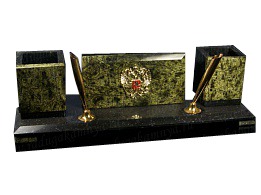 Письменный прибор "с гербом". Материал: змеевик, латунь. Техника исполнения: токарные и слесарные работы, рисовка кистью на металле, художественное литье, многоступенчатая гравировка иглой по лаку, травление, ручная подрезка, полировка. Набор изготовлен из природных материалов высокого качества. Филигранная проработка деталей характеризует безупречную работу мастера. Изделие станет изысканным статусным подарком для Vip персоны, великолепно впишется в богатый интерьер дома или рабочего кабинета. Возможно изготовление по индивидуальным эскизам с нанесением корпоративной символики.