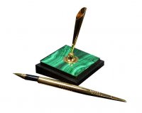 Подставка с ручкой из малахита. Материал; малахит, латунь. Техника исполнения: токарные и слесарные работы, рисовка кистью на металле, художественное литье, многоступенчатая гравировка иглой по лаку, травление, ручная подрезка, полировка. Набор изготовлен из природных материалов высокого качества. Филигранная проработка деталей характеризует безупречную работу мастера. Изделие станет изысканным статусным подарком для Vip персоны, великолепно впишется в богатый интерьер дома или рабочего кабинета. Возможно изготовление по индивидуальным эскизам с нанесением корпоративной символики.