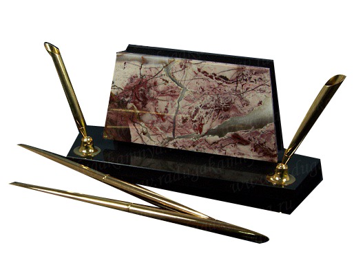 Настольный прибор "визитница". Материал: яшма, долерит, латунь. Техника исполнения: токарные и слесарные работы, рисовка кистью на металле, художественное литье, многоступенчатая гравировка иглой по лаку, травление, ручная подрезка, полировка. Набор изготовлен из природных материалов высокого качества. Филигранная проработка деталей характеризует безупречную работу мастера. Изделие станет изысканным статусным подарком для Vip персоны, великолепно впишется в богатый интерьер дома или рабочего кабинета. Возможно изготовление по индивидуальным эскизам с нанесением корпоративной символики.