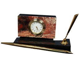 Настольный прибор "часы визитница". Материал: яшма, латунь. Техника исполнения: токарные и слесарные работы, рисовка кистью на металле, художественное литье, многоступенчатая гравировка иглой по лаку, травление, ручная подрезка, полировка. Набор изготовлен из природных материалов высокого качества. Филигранная проработка деталей характеризует безупречную работу мастера. Изделие станет изысканным статусным подарком для Vip персоны, великолепно впишется в богатый интерьер дома или рабочего кабинета. Возможно изготовление по индивидуальным эскизам с нанесением корпоративной символики.