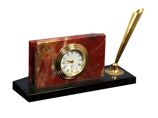 Настольный прибор "часы визитница". Материал: яшма, латунь. Техника исполнения: токарные и слесарные работы, рисовка кистью на металле, художественное литье, многоступенчатая гравировка иглой по лаку, травление, ручная подрезка, полировка. Набор изготовлен из природных материалов высокого качества. Филигранная проработка деталей характеризует безупречную работу мастера. Изделие станет изысканным статусным подарком для Vip персоны, великолепно впишется в богатый интерьер дома или рабочего кабинета. Возможно изготовление по индивидуальным эскизам с нанесением корпоративной символики.