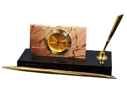 Настольный прибор "часы визитница". Материал: яшма, латунь. Техника исполнения: токарные и слесарные работы, рисовка кистью на металле, художественное литье, многоступенчатая гравировка иглой по лаку, травление, ручная подрезка, полировка. Набор изготовлен из природных материалов высокого качества. Филигранная проработка деталей характеризует безупречную работу мастера. Изделие станет изысканным статусным подарком для Vip персоны, великолепно впишется в богатый интерьер дома или рабочего кабинета. Возможно изготовление по индивидуальным эскизам с нанесением корпоративной символики.