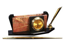 Настольный прибор "часы визитница". Материал: яшма, латунь. Техника исполнения: токарные и слесарные работы, рисовка кистью на металле, художественное литье, многоступенчатая гравировка иглой по лаку, травление, ручная подрезка, полировка. Набор изготовлен из природных материалов высокого качества. Филигранная проработка деталей характеризует безупречную работу мастера. Изделие станет изысканным статусным подарком для Vip персоны, великолепно впишется в богатый интерьер дома или рабочего кабинета. Возможно изготовление по индивидуальным эскизам с нанесением корпоративной символики.