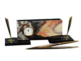 Письменный прибор "карандашница". Материал: яшма, латунь. Техника исполнения: токарные и слесарные работы, рисовка кистью на металле, художественное литье, многоступенчатая гравировка иглой по лаку, травление, ручная подрезка, полировка. Набор изготовлен из природных материалов высокого качества. Филигранная проработка деталей характеризует безупречную работу мастера. Изделие станет изысканным статусным подарком для Vip персоны, великолепно впишется в богатый интерьер дома или рабочего кабинета. Возможно изготовление по индивидуальным эскизам с нанесением корпоративной символики.