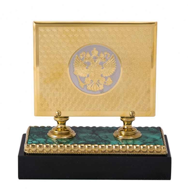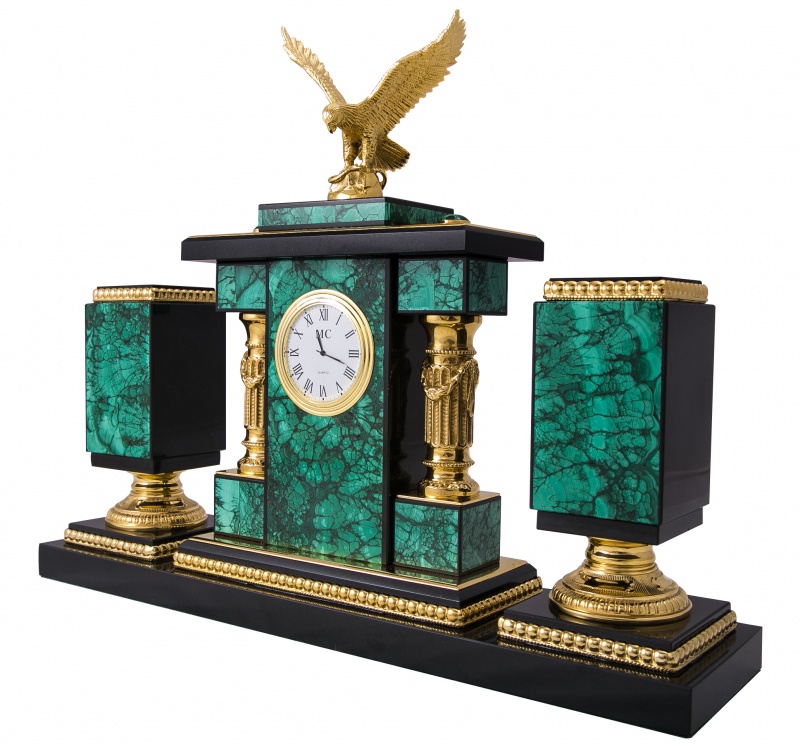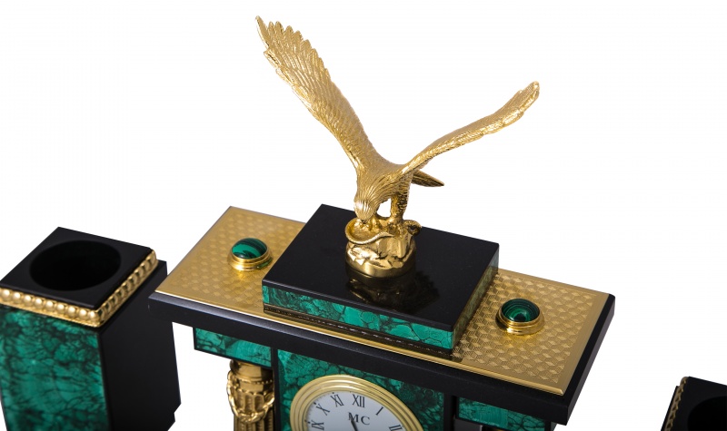Письменный набор «Горный орел» - это эксклюзивное произведение искусства. Набор ручной работы изготовлен из малахита, латуни и долерита, покрытый золотом и никелем. Это, несомненно, дорогой и благородный подарок для VIP-персон. В набор входят все необходимые канцелярские принадлежности, включая часы, на которых гордо восседает фигура орла. Письменный набор выполнен из натуральных природных материалов. Украшает его изысканная гравировка, которая придает ему статусности и роскоши. Набор прекрасно подчеркнет стиль и вкус, а также положение в обществе его обладателя.