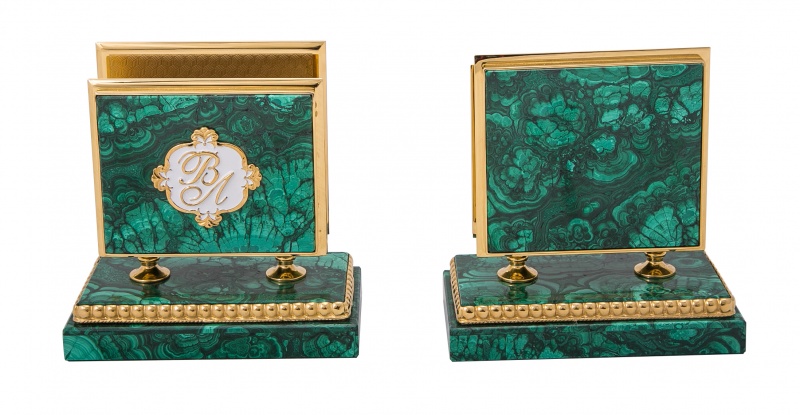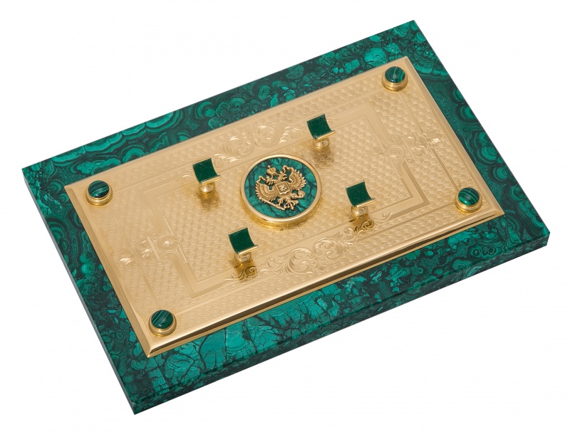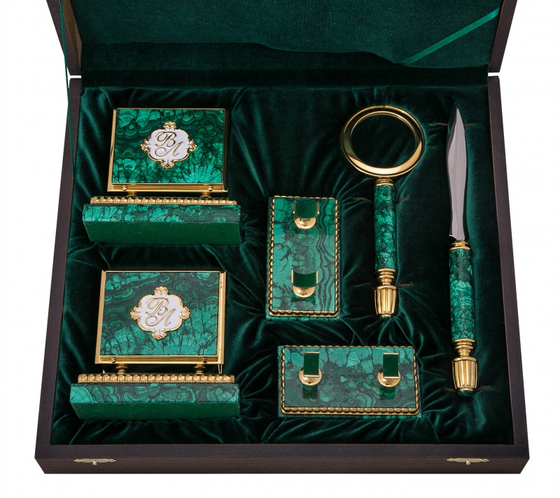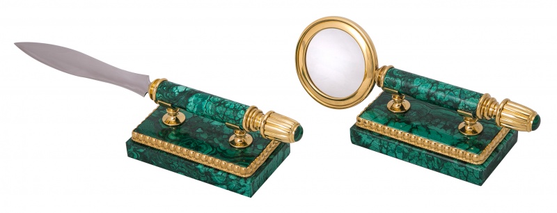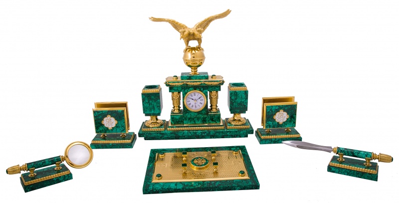 Письменный набор "руководитель" из малахита . Материал: малахит, латунь, инкрустация ювелирными камнями, клинок из стали ЭИ-107. Покрытия: золотом 999,9; никелем. Техника исполнения: токарные и слесарные работы, рисовка кистью на металле, художественное литье, многоступенчатая гравировка иглой по лаку, травление, ручная подрезка, полировка. Малахитовый набор ручной работы для настоящего руководителя. Изысканный дизайн, качественные материалы, оформление с учетом пожеланий заказчика… Такой набор можно хранить в качестве сувенира или использовать по назначению на своем рабочем месте. Ведь, помимо всего прочего, малахитовый набор руководителя обладает высокими качественными характеристиками. Размеры: корпус 380х310х90 мм, визитница 125х110х60 мм, календарница 30х260х170 мм, нож 70х220х70 мм, лупа 70х170х70 мм. Покрытие Гальванический метод