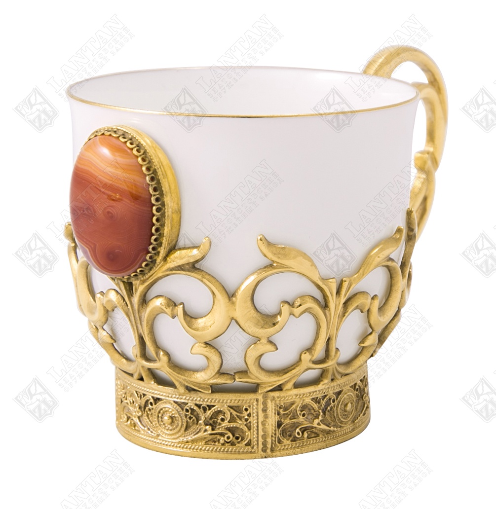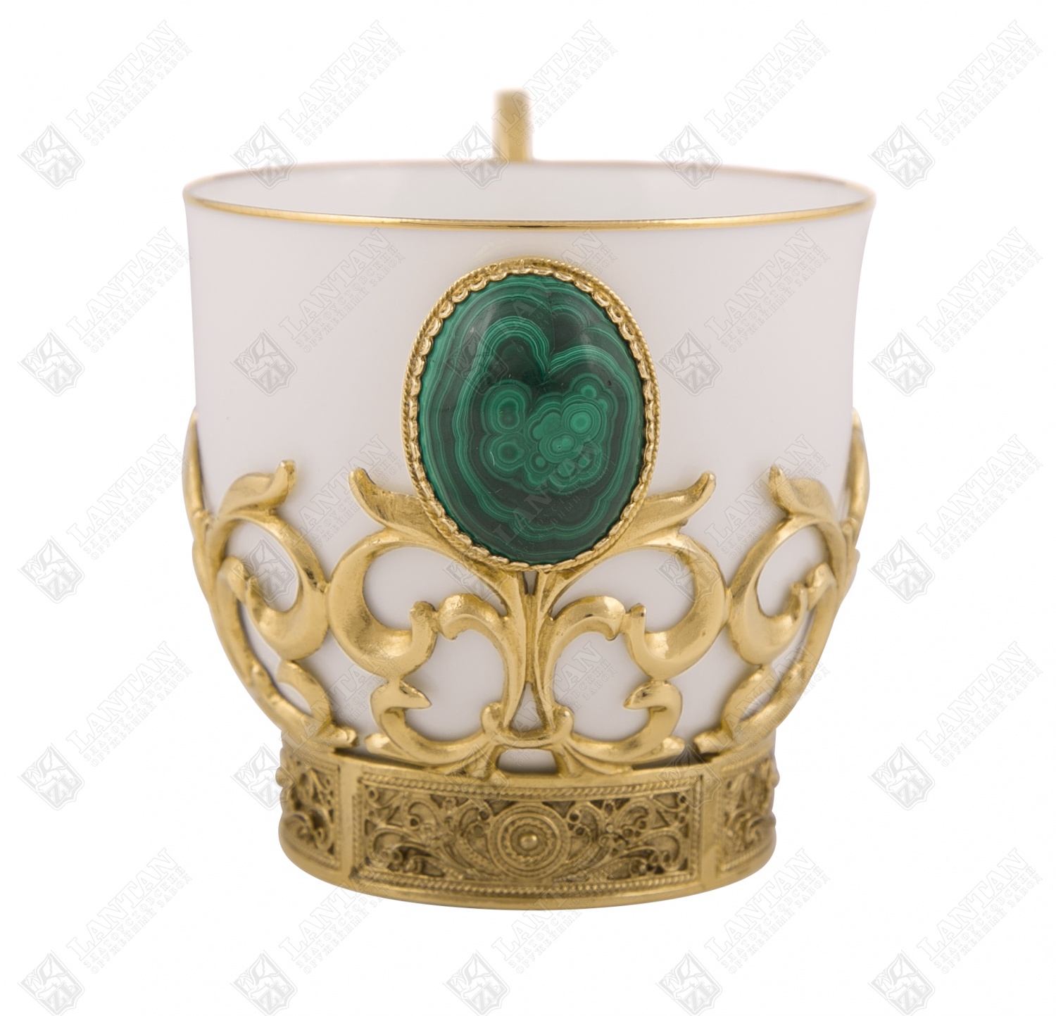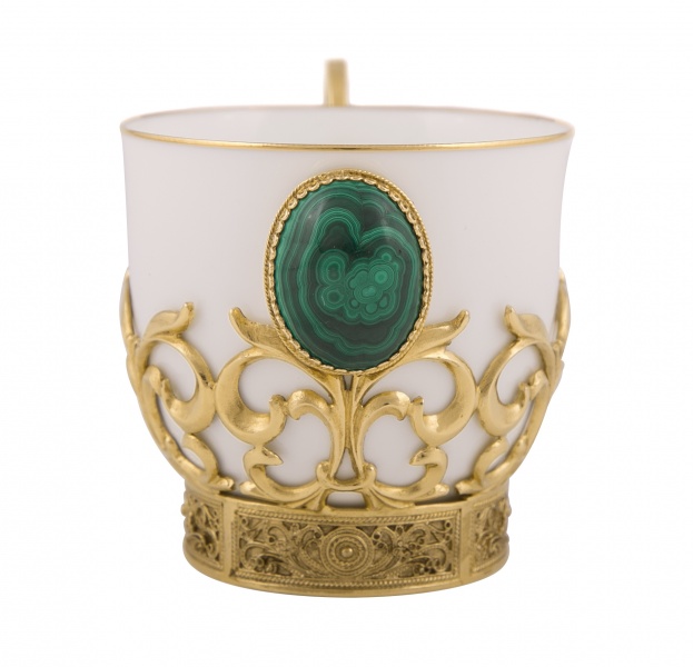 Чашка кофейная "узор" (в ассортименте) златоуст. Материал: латунь, костяной фарфор, малахит, лазурит, сердолик. Покрытие: золотом 999,9; никелем. Материал: латунь, костяной фарфор, малахит. Покрытие: золотом 999,9; никелем. Техника исполнения: художественное литье, токарные и слесарные работы, рисовка кистью на металле, многоступенчатая гравировка иглой по лаку, травление, ручная подрезка. Изящная кофейная чашка из костяного фарфора станет отличным подарком на любое торжество для женщины-руководителя. Такое изделие, как нельзя лучше продемонстрирует лояльное отношение подчиненных и их высокую оценку качеств руководителя. Венец композиции – это натуральный камень, заключенный в объемную латунную оправу. На усмотрение покупателя в оформлении может быть использован лазурит, сердолик или малахит. Благодаря использованию каждого из этих камней, внешне одинаковые чашки смотрятся совершенно по-разному Покрытие Гальванический метод