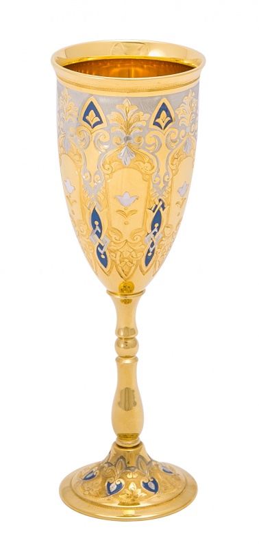 Фужер "медовый месяц" златоуст. Материал: латунь. Покрытие: золотом 999,9; никелем. Техника исполнения: токарные и слесарные работы, рисовка кистью на металле, многоступенчатая гравировка иглой по лаку, травление, ручная подрезка, полировка. Латунный фужер «Медовый месяц», с покрытием из золота и никеля, призван стать отличным подарком на годовщину, памятную дату и т.д. Изделие не имеет срока годности, не тускнеет и не деформируется с течением времени. Узор ручной работы, нанесенный на фужеры, не выходит из моды и вызывает восхищение у людей самых разных возрастов. В особенный день обладателю такого подарка наверняка будет приятно достать памятный фужер и заново пережить все приятные эмоции! Размеры: высота - 180 мм. ширина - 55 мм. Покрытие Гальванический метод