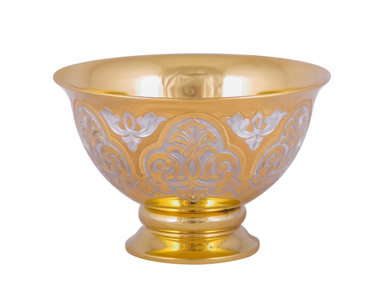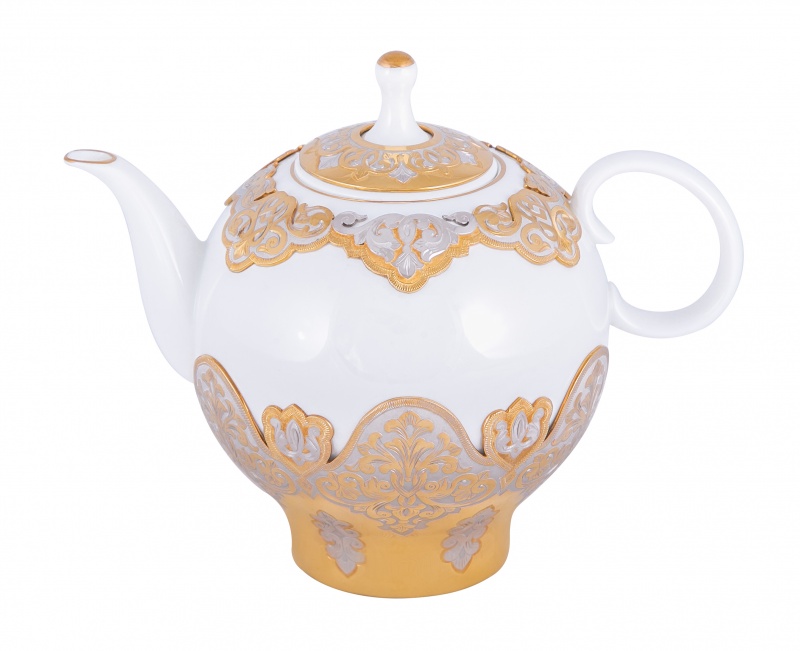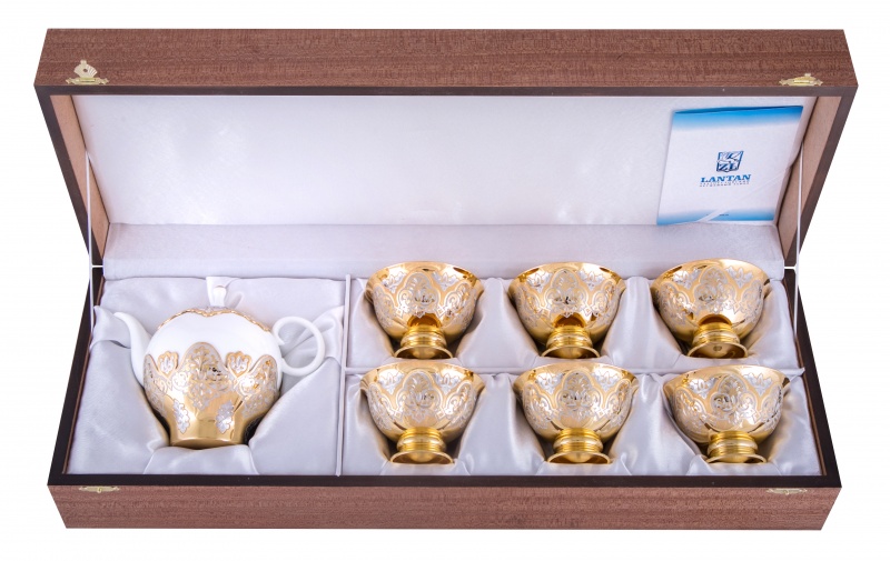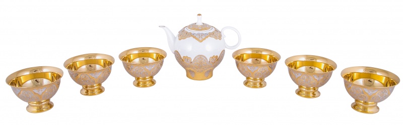Набор чайный "караван" (заварочник, 6 пиал). Материал: латунь, костяной фарфор. Покрытие: золотом 999,9; никелем. Техника исполнения: токарные и слесарные работы, рисовка кистью на металле, многоступенчатая гравировка иглой по лаку, травление, ручная подрезка, художественная выпиловка, полировка. В мире тотальной суеты прием чая давно стал бытовой необходимостью, а не церемонией. Настало время возродить традиции, приобретя набор «Караван». Помимо заварочного чайника, в наборе идут пиалы, редко встречающиеся в современном доме. С их помощью можно организовать настоящую восточную церемонию, да и просто хорошо провести время в кругу близких людей! Размеры: заварочник: ширина 170 мм, высота 140 мм. пиала: ширина 95 мм, высота 90 мм Покрытие Гальванический метод