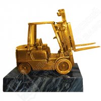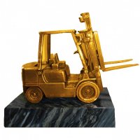Сувенир погрузчик. Материал: змеевик, латунь. Покрытия: золотом 999,9; никелем. Техника исполнения: токарные и слесарные работы, художественное литье, полировка. Стоимость зависит от размеров и используемого материала (из серебра, золота или медного сплава с покрытием из драгоценных металлов). Художественное литье – это отливка художественных произведений с высокой детализации элементов работы. Наши дизайнеры и ювелиры создают поистине уникальные изделия. А высокие требования точности изготовления литьевых форм с высоким рельефом, в зависимости от приемов работы, обеспечивается использованием современных 3D технологий. Изготовленное клише, например, с логотипом компании, профилем юбиляра, Гербом страны или барельефом Героя послужит бесценным подарком для родных, близких, коллег по работе и бизнесу. Размеры: высота 190 мм. Покрытие Гальванический метод