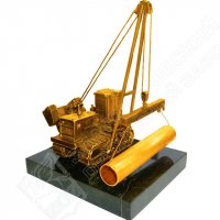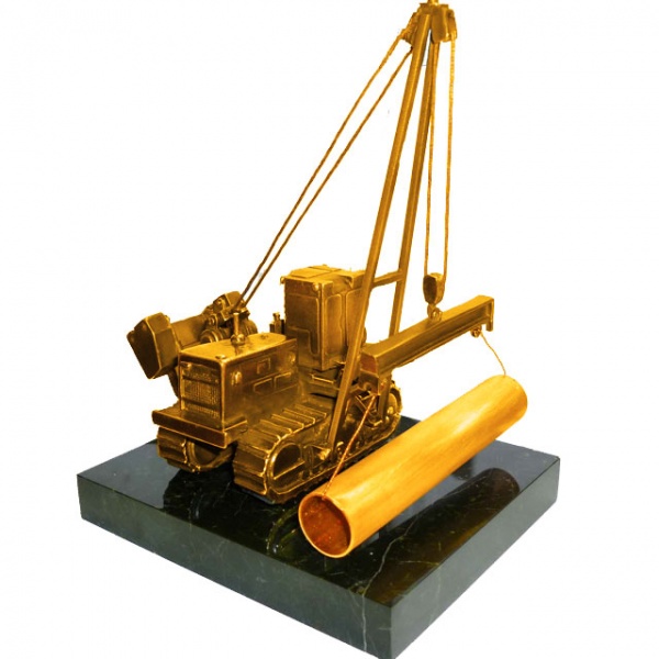 Сувенир трубоукладчик. Материал: змеевик, латунь. Покрытия: золотом 999,9; никелем. Техника исполнения: токарные и слесарные работы, художественное литье, полировка. Стоимость зависит от размеров и используемого материала (из серебра, золота или медного сплава с покрытием из драгоценных металлов). Художественное литье – это отливка художественных произведений с высокой детализации элементов работы. Наши дизайнеры и ювелиры создают поистине уникальные изделия. А высокие требования точности изготовления литьевых форм с высоким рельефом, в зависимости от приемов работы, обеспечивается использованием современных 3D технологий. Изготовленное клише, например, с логотипом компании, профилем юбиляра, Гербом страны или барельефом Героя послужит бесценным подарком для родных, близких, коллег по работе и бизнесу. Размеры: ысота 190 мм. Покрытие Гальванический метод