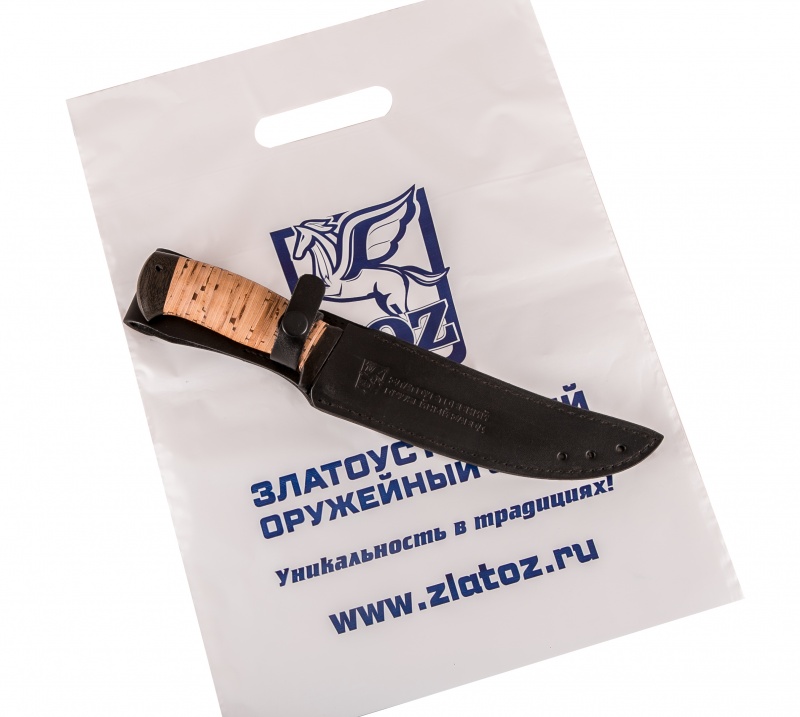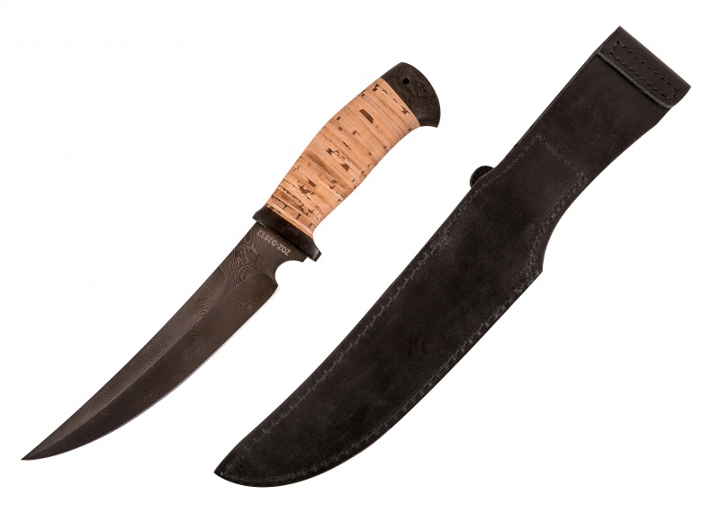 Нож сурукуку (сталь дамасская, береста). Материал: клинок из дамасской стали; рукоять из бересты; тыльник, гарда - текстолит; кожаные ножны. Техника исполнения: токарные и слесарные работы, полировка. ? ×сталь Тип стали Кованая дамасская (ZOZ-D2832) Общая длина, мм 298 Длина клинка, мм 175 Ширина клинка, мм 33 Толщина клинка, мм 3.8 Твердость клинка, HRC 58-62 Вес ножа, кг 0.17 Вес брутто, кг 0.26