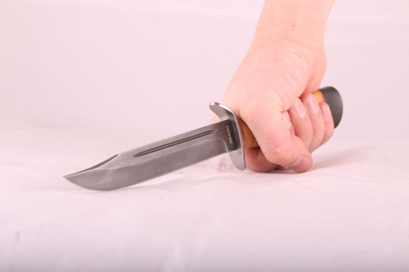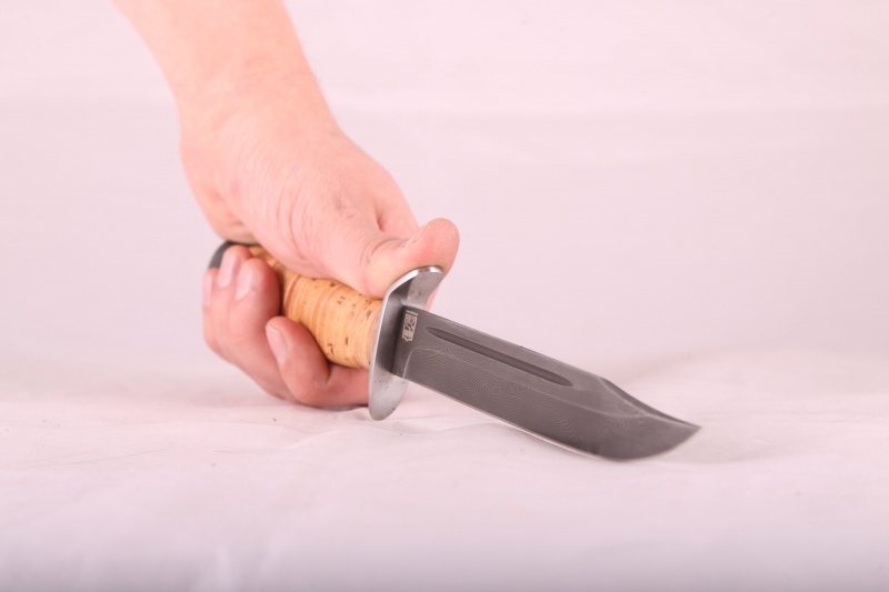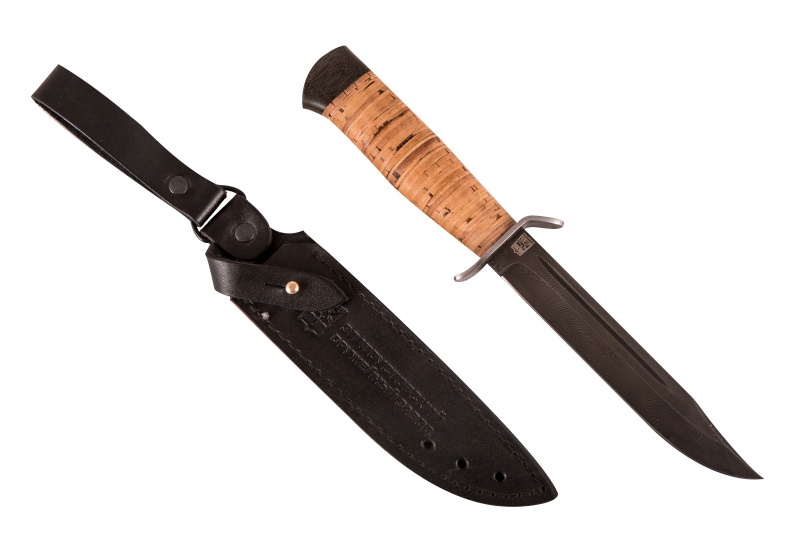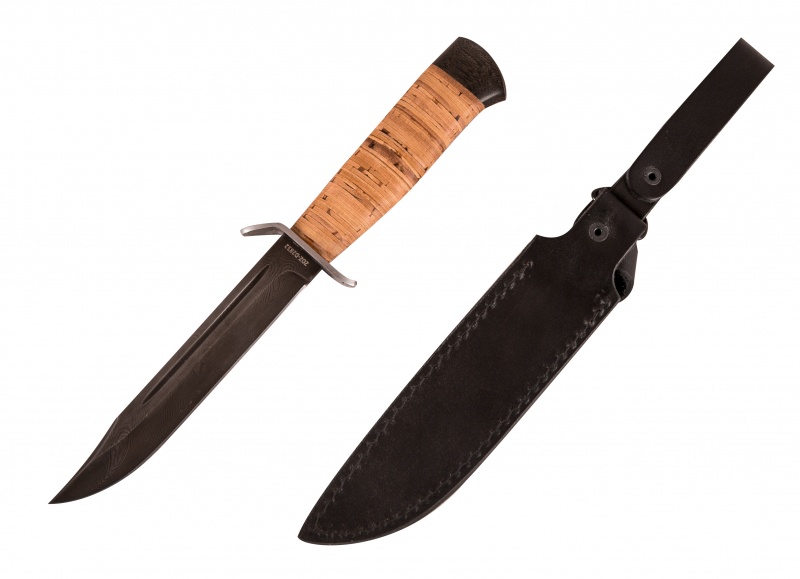 Нож разведчика (сталь дамасская, береста). Материал: клинок из дамасской стали; рукоять из бересты; тыльник - текстолит; кожаные ножны. Техника исполнения: токарные и слесарные работы, полировка. ? ×сталь Тип стали Кованая дамасская (ZOZ-D2832) Общая длина, мм 260 Длина клинка, мм 140 Ширина клинка, мм 22 Толщина клинка, мм 2.4 Твердость клинка, HRC 58-62 Вес ножа, кг 0.114 Вес брутто, кг 0.17