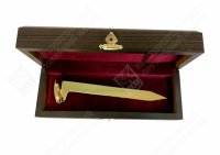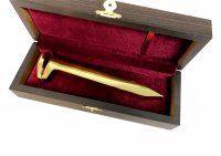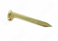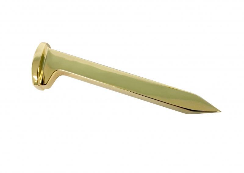 Сувенир железнодорожный гвоздь. Материал: латунь. Покрытие: золотом 999,9; никелем. Техника исполнения: токарные и слесарные работы, рисовка кистью на металле, многоступенчатая гравировка иглой по лаку, травление, ручная подрезка, полировка. Размеры: длина - 165 мм. Покрытие Гальванический метод