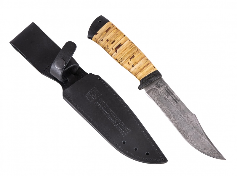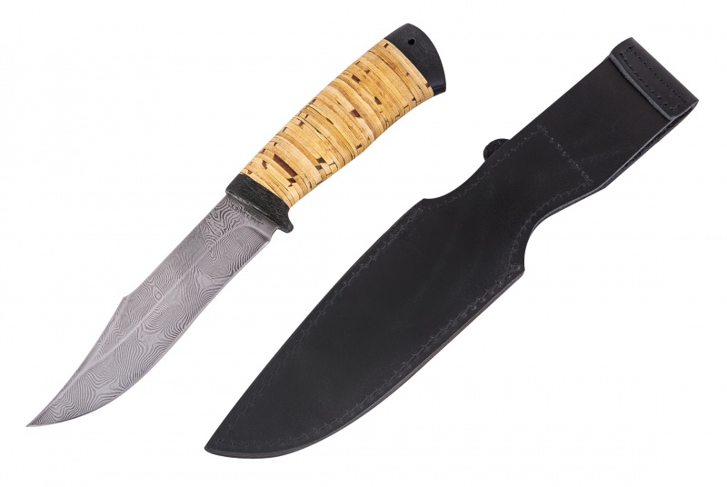 Нож койот (сталь дамасская, береста). Материал: клинок из дамасской стали; рукоять из бересты; тыльник, гарда - текстолит; кожаные ножны. Техника исполнения: токарные и слесарные работы, полировка. ? ×сталь Тип стали Кованая дамасская (ZOZ-D2832) Общая длина, мм 250 Длина клинка, мм 150 Ширина клинка, мм 30 Толщина клинка, мм 2.2 Твердость клинка, HRC 58-62 Вес ножа, кг 0.13 Вес брутто, кг 0.2