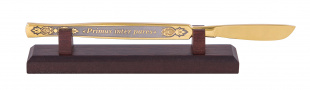 Сувенир скальпель primus inter pares на подставке в коробке. Материал: сталь ЭИ - 107, подставка из ценных пород дерева - сопель, коробка. Покрытие: золотом 999,9; никелем. Техника исполнения: токарные и слесарные работы, рисовка кистью на металле, многоступенчатая гравировка иглой по лаку, травление, ручная подрезка, полировка. Действительно оригинальный и дорогой подарок врачу. Сувенирный скальпель выполнен из стали с золотым покрытием на подставке из ценных пород дерева, дополнен красивой гравировкой и росписью. На изделии золотыми буквами выложена символичная надпись на латыни «Первый среди равных». Сложно представить себе лучший подарок для талантливого хирурга! Размеры: скальпель 170х10 мм. скальпель на подставке 140х35 мм. Покрытие Гальванический метод