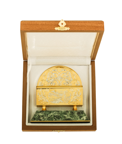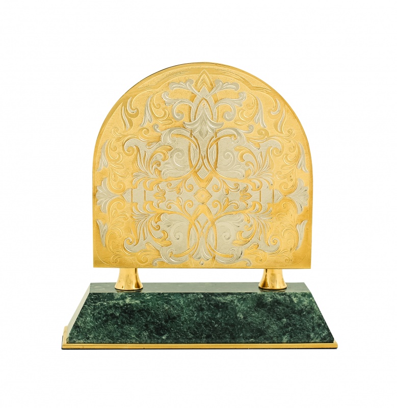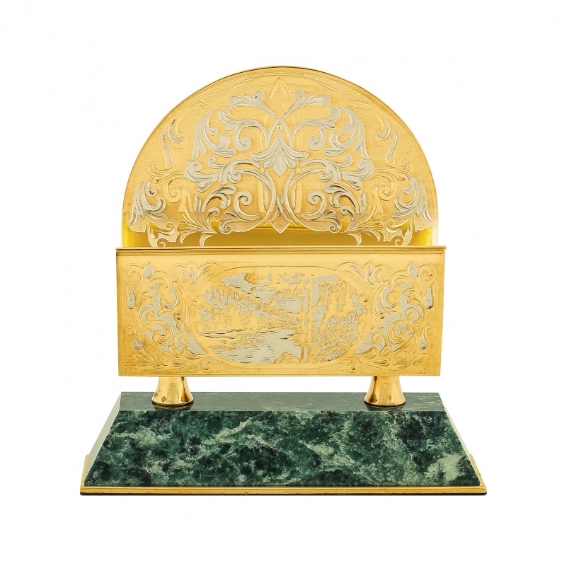 Визитница настольная "природа" златоуст. Материал: латунь, змеевик. Покрытия: золотом 999,9; никелем. Техника исполнения: слесарные работы, рисовка кистью на металле, многоступенчатая гравировка иглой по лаку, травление, ручная подрезка, полировка, Элитная визитница настольная «Природа» станет хорошим подарком для вашего партнера по бизнесу или коллеги. Подарок ручной работы отлично подчеркнет стиль помещения и харизму своего обладателя. Визитница изготовлена из латуни и природного камня змеевика. Такой подарок придется по нраву не только мужчине-руководителю, но и окажется по вкусу любой бизнес леди. Размеры: Высоата - 120 мм Ширина - 120 мм Покрытие Гальванический метод