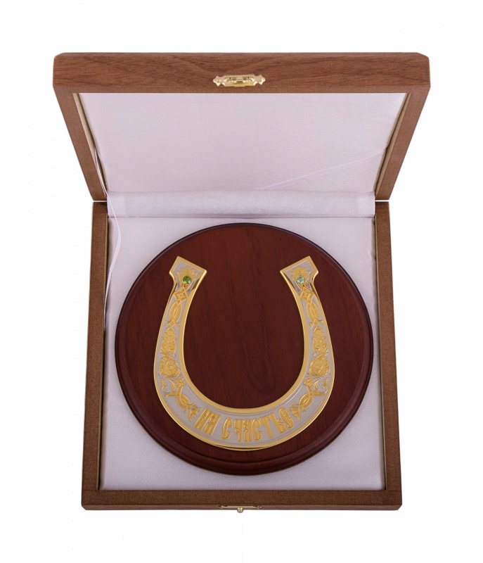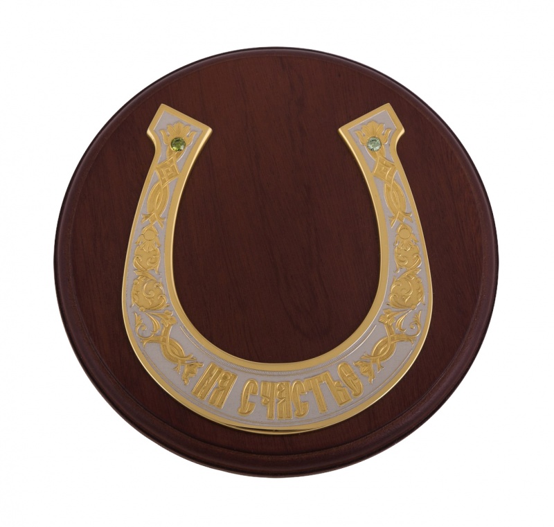 Сувенир "подкова на счастье" на деревянной подложке златоуст. Материал: латунь, ценных пород дерева - сопель, фианит. Покрытие: золотом 999,9; никелем. Оригинальный сувенир «Подкова на счастье» на деревянной подложке прекрасно подойдет в качестве подарка на любой праздник или деловое мероприятие для ваших близких друзей или коллег. Он выполнен из высококачественной латуни и ценных пород дерева - сопель. Подкова покрыта золотом и никелем и инкрустирована на кончиках двумя фианитами красивого зеленоватого оттенка. Размеры: Диаметр 150 мм Покрытие Гальванический метод