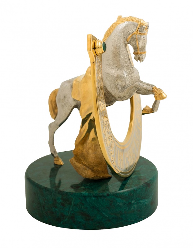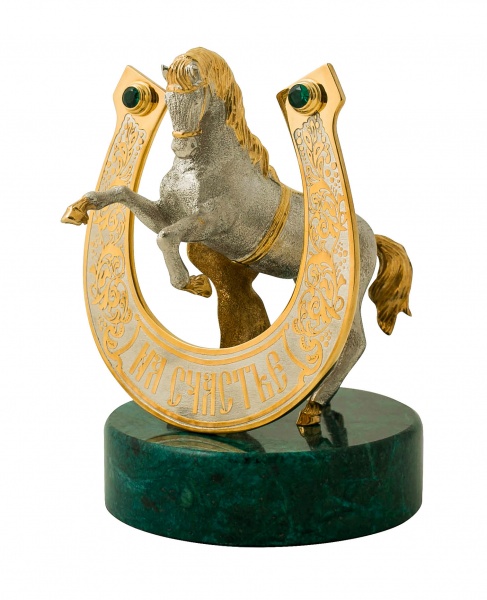Сувенир "подкова с конем "на счастье" из змеевика. Материал: латунь, змеевик, фианит. Покрытие: золотом 999,9; никелем. Техника исполнения: токарные и слесарные работы, рисовка кистью на металле, многоступенчатая гравировка иглой по лаку, травление, ручная подрезка, полировка. Эксклюзивный и дорогой сувенир «Подкова с конем» выполнена из латуни, покрытая золотом и никелем, подставка изготовлена и змеевика. Уникальное трехмерное изображение коня с золотой гривой и подковами станет прекрасным подарком для VIP-персон. Подкова ручной работы инкрустирована фианитами темно-зеленого цвета и имеет надпись «На счастье». Размеры: Высота - 160 мм Ширина - 105 мм Покрытие Гальванический метод