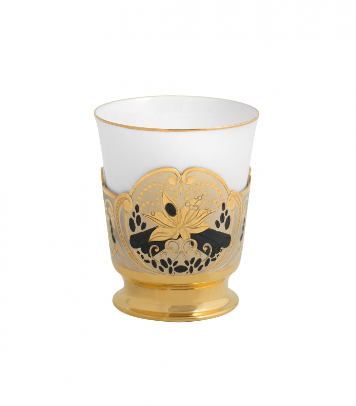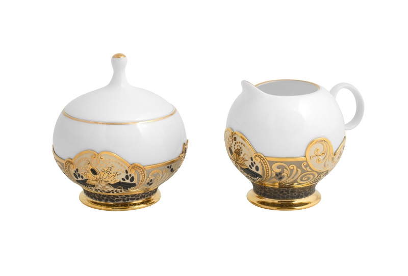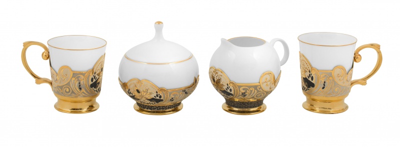 Кофейный набор «Кофе с корицей» станет дорогим и оригинальным подарком для каждой женщины и прекрасным украшением обеденного стола. В эксклюзивную коллекцию входят 2 чашки, 2 ложки, сливочник, сахарница, изготовленные из костяного фарфора, и круглое блюдо из латуни. Уникальные изделия ручной работы украшены гравировкой и покрыты золотом и серебром.