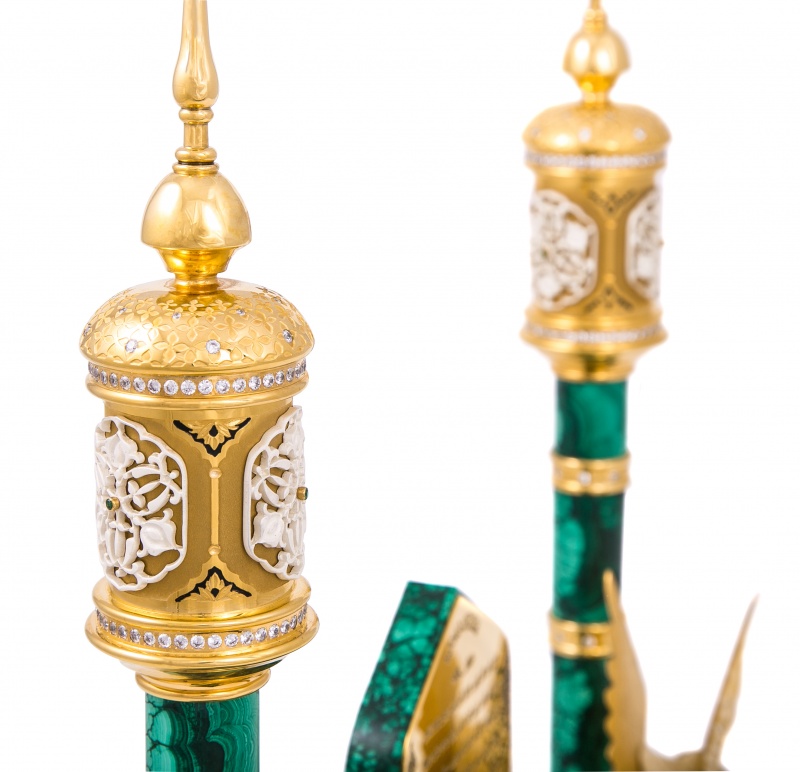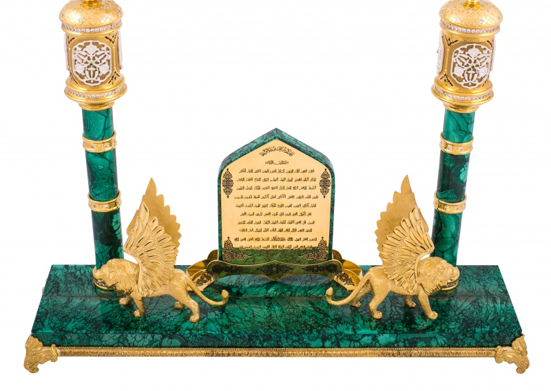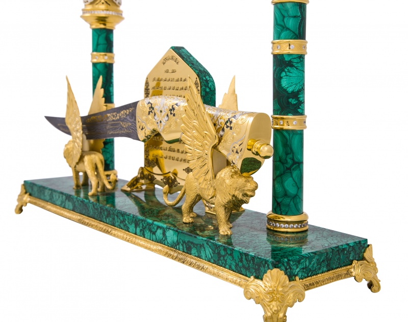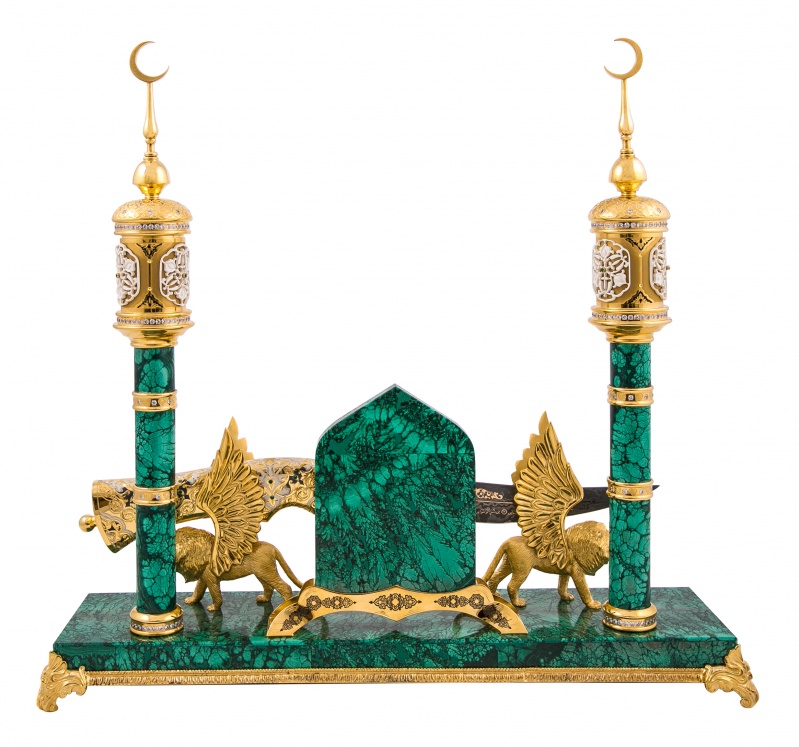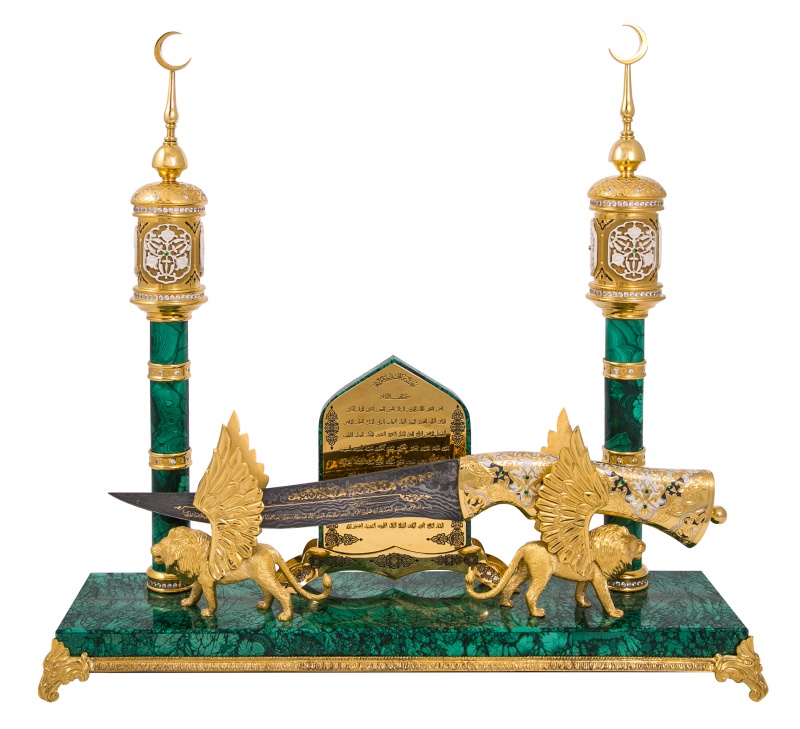 Композиция "тайное знание" от златоустовский оружейный завод лан. Материал: клинок из дамасской стали; рукоять ножи из латуни; основание из малахита; инкрустация ювелирными камнями. Покрытие: золотом 999,9; серебром 925; никелем. Украшают композицию грифоны - мифические крылатые существа, с туловищем и головой льва, которые имеют острые когти и золотые крылья. Грифон выступает в роли стража. Он стережет сокровища или сокровенное, тайное знание, воплощенные в драгоценном ноже. Бесценный нож инкрустирован изумрудами и рубинами. На клинке, из знаменитой дамасской стали, располагаются Аль-Фатиха — первая сура Корана, и Сура Люди — последняя, 114 сура Корана. В центре композиции располагаются Прекрасные Имена Аллахa (Аллаhа). Список в 99 имен возводится к хадису от Абу Хурайры, в котором Пророк называет цифру 99 и предрекает рай тем, кто повторяет имена Аллаха в молитвах. Размеры: Ширина - 420 мм. Глубина- 110 мм. Общая высота - 400 мм. Покрытие Гальванический метод