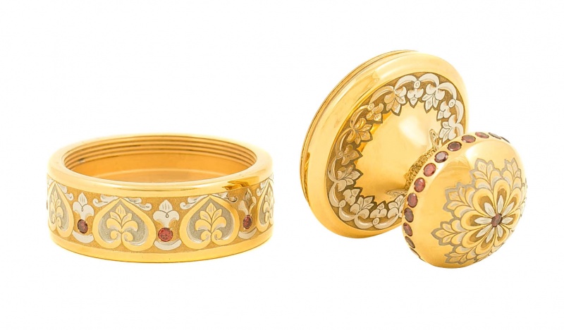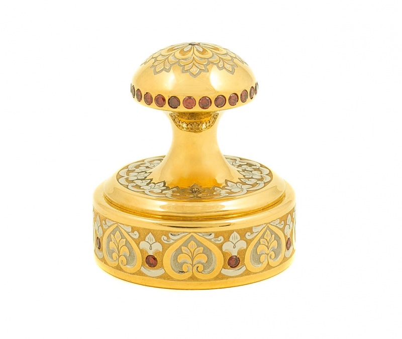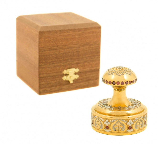 Печать малая с фианитами "процветание". Материал: латунь, фианит. Покрытие: золотом 999,9; никелем. Техника исполнения: токарные и слесарные работы, рисовка кистью на металле, многоступенчатая гравировка иглой по лаку, травление, ручная подрезка, полировка. Для того, чтобы выразить уважение к вышестоящему должностному лицу достаточно преподнести в подарок малую печать «Процветание». Это поистине дорогое и эксклюзивное изделие ручной работы придется по нраву даже самому требовательному боссу. Печать покрыта золотом и никелем, украшена фианитами рубинового цвета. Она достойно займет место в рабочем кабинете. Размеры: Высота: 55 мм. Ширина: 50 мм. Покрытие Гальванический метод