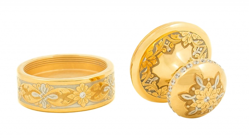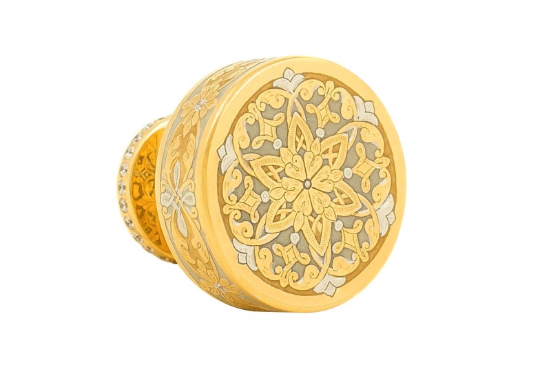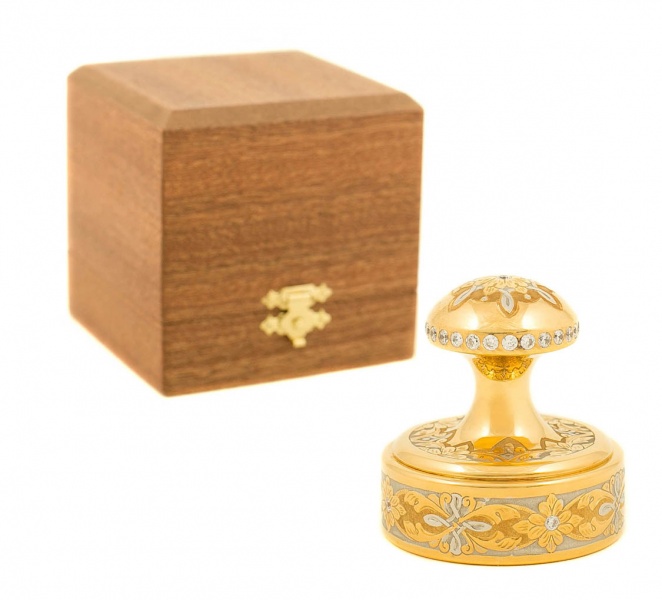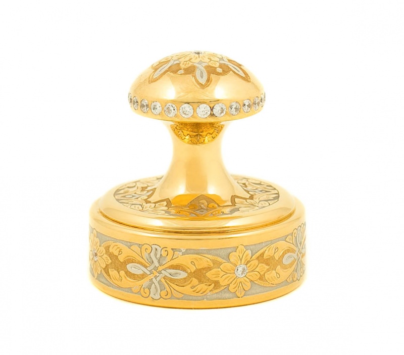 Печать малая с фианитами "процветание". Материал: латунь, фианит. Покрытие: золотом 999,9; никелем. Техника исполнения: токарные и слесарные работы, рисовка кистью на металле, многоступенчатая гравировка иглой по лаку, травление, ручная подрезка, полировка. Эксклюзивная малая печать «Процветание» - это воплощение вкуса и роскоши. Она изготовлена из латуни, покрытая золотом и инкрустирована белыми фианитами. Такой подарок по достоинству оценит каждая леди-босс. Многоступенчатая уникальная гравировка в виде орнамента, придает ей изящности и оригинальности. Отлично подойдет в качестве презента на открытие бизнес-офиса. Размеры: Высота: 55 мм. Ширина: 50 мм. Покрытие Гальванический метод