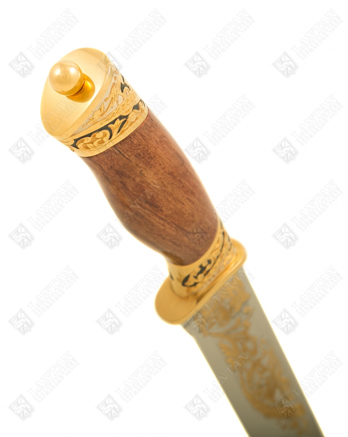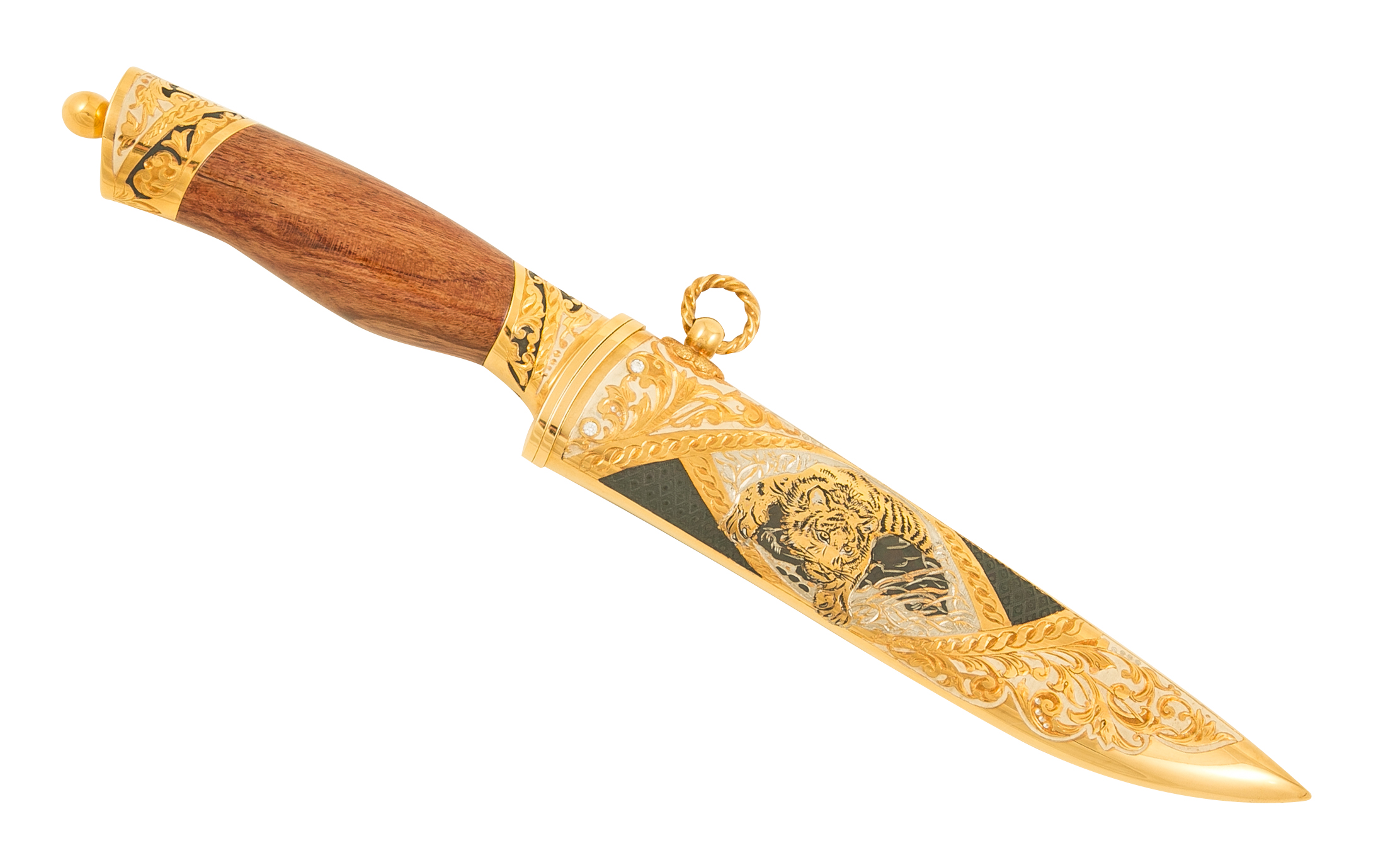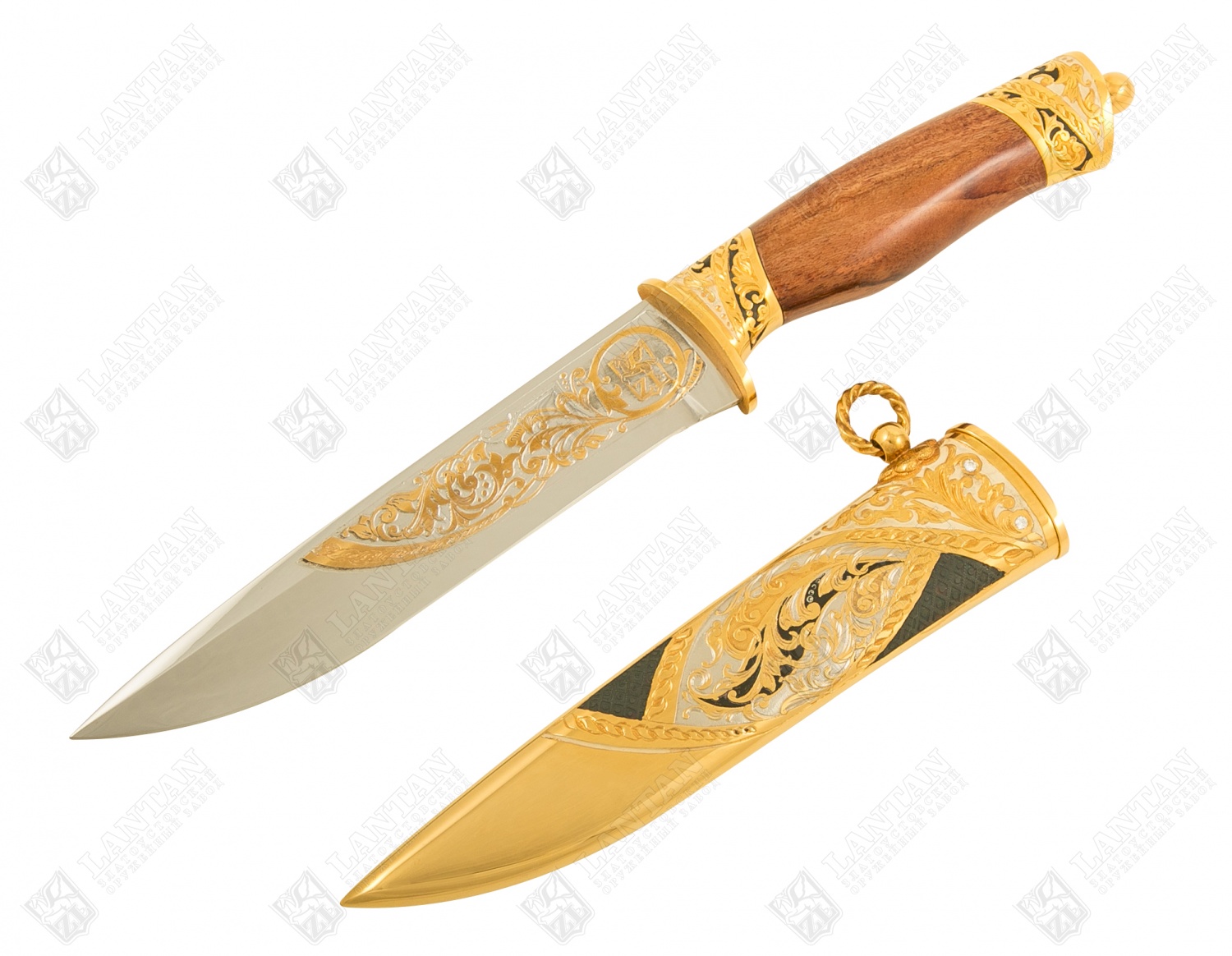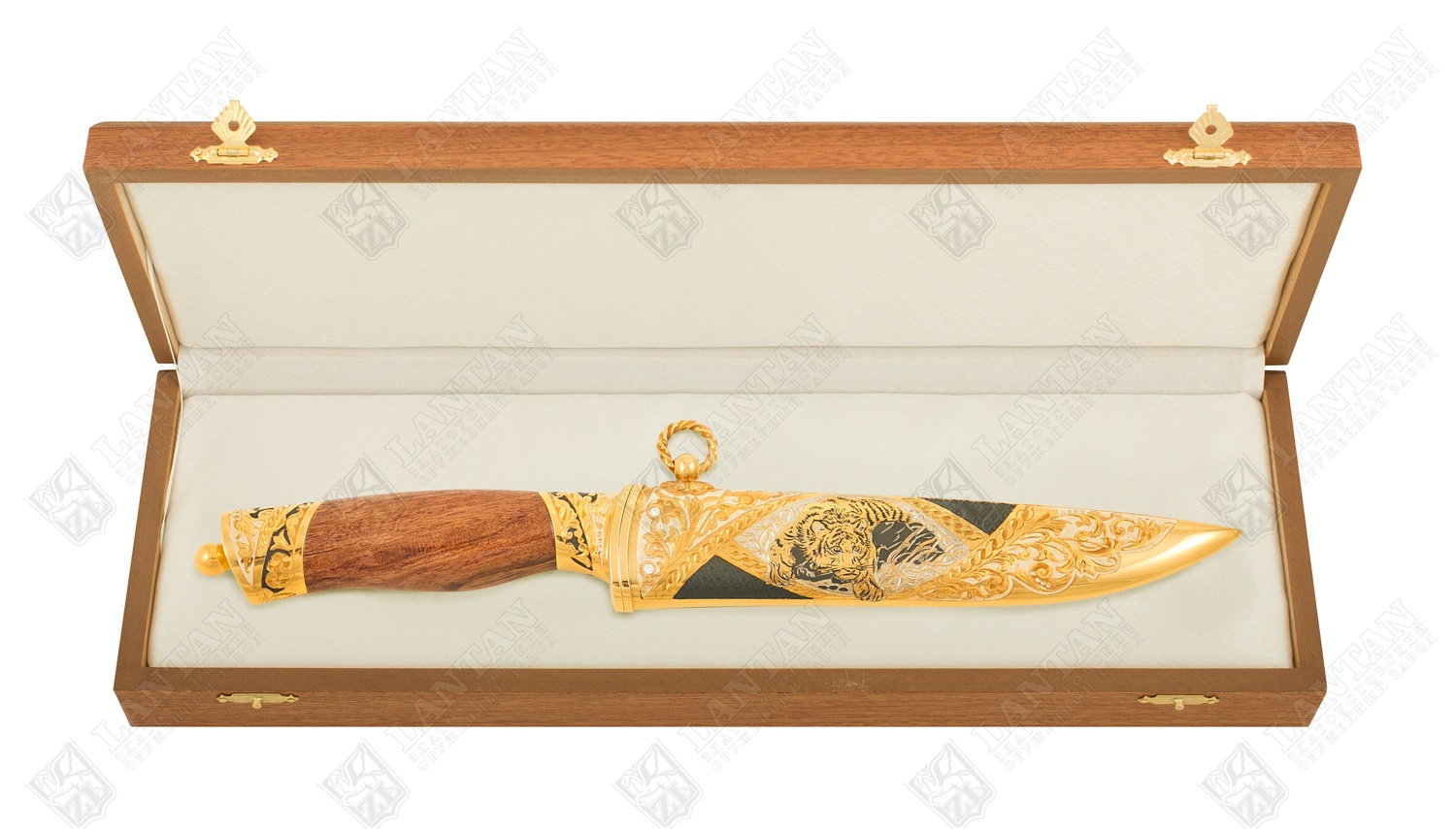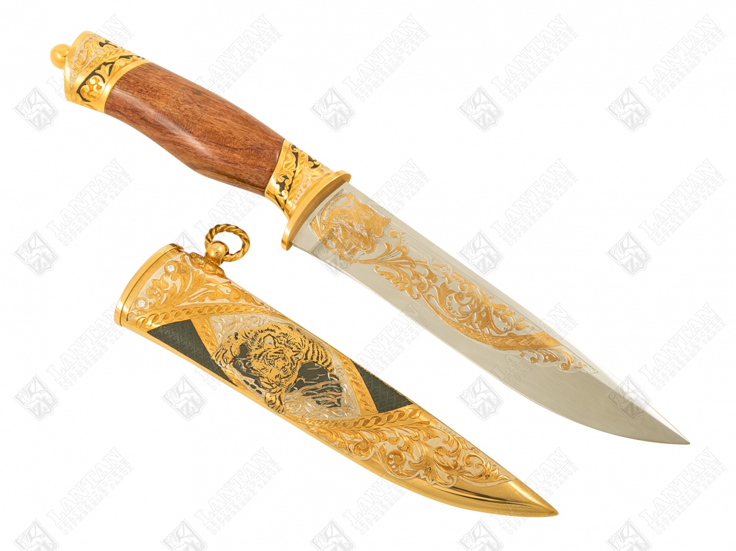 Нож цм "бланк - уссурийский тигр" из нержавеющей стали эи-107(за. Материал: клинок из стали ЭИ-107 (закалка 55 ед. по шкале Роквелла); ножны из латуни; инкрустация ювелирными камнями; рукоять из граба. Покрытие: золотом 999,9; серебром 925; никелем. Техника исполнения: токарные и слесарные работы, рисовка кистью на металле, многоступенчатая гравировка иглой по лаку, травление, ручная подрезка, полировка, чернение латуни. Нож «Бланк – Уссурийский тигр» - это сувенирное холодное оружие ручной работы. 17ти сантиметровый клинок изготовлен из стали, высокопрочен и долговечен. Материал ножен – латунь. Рукоять из добротного граба. Все изделие украшено узорами, инкрустировано ювелирными камнями, имеет покрытие золота, серебра и никеля, на ножнах изображение тигра. Вставки черного цвета делаю нож строгим и утонченным. Размеры: общая длина - 340 мм длина клинка - 170 мм ширина клинка - 30 мм ? ×сталь Тип стали Кованая нержавеющая 40Х10С2М(ЭИ-107) Покрытие Гальванический метод