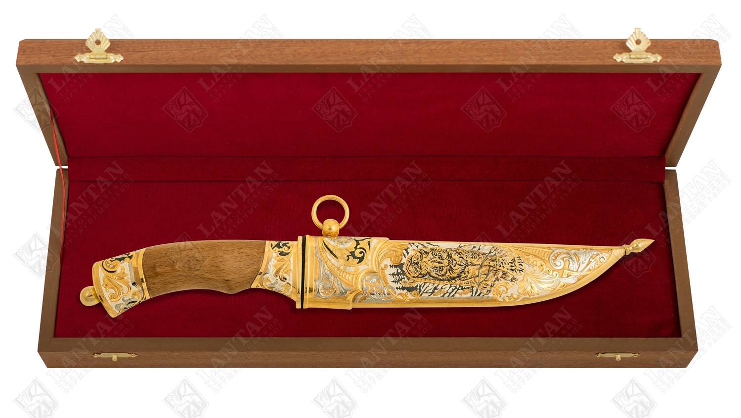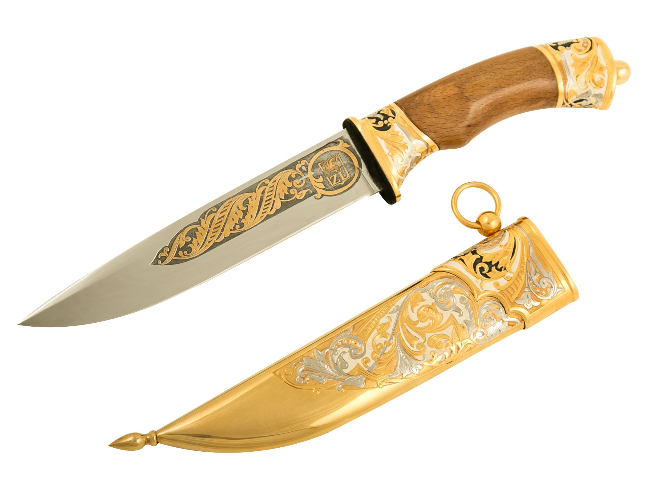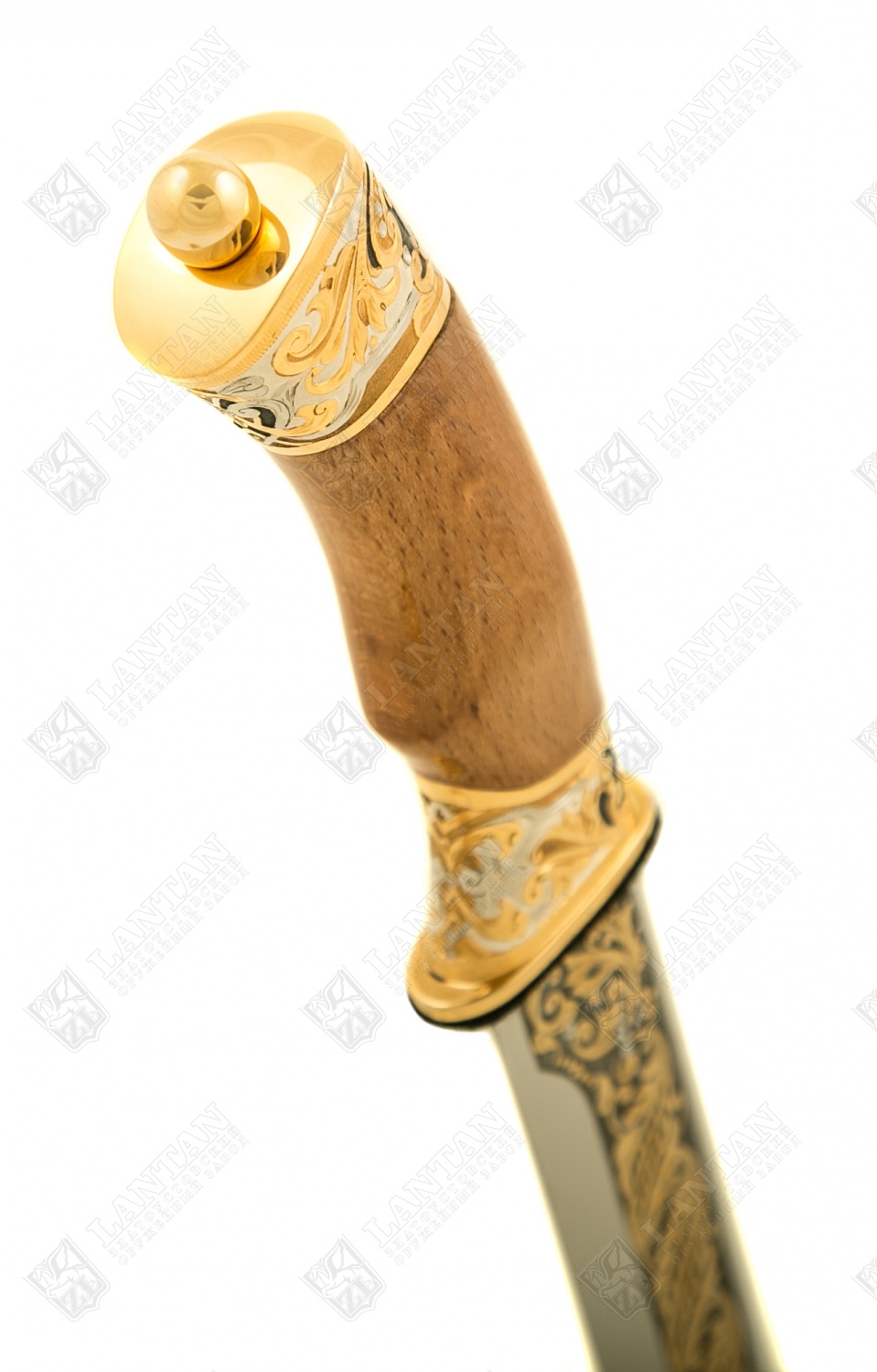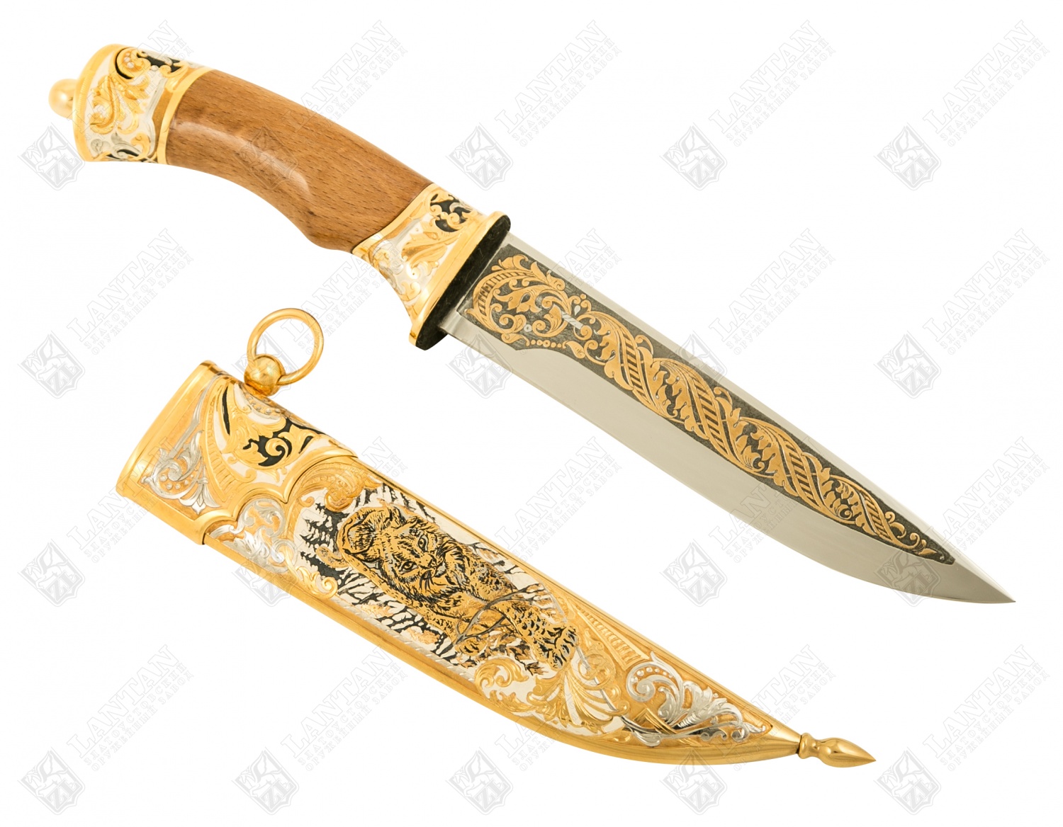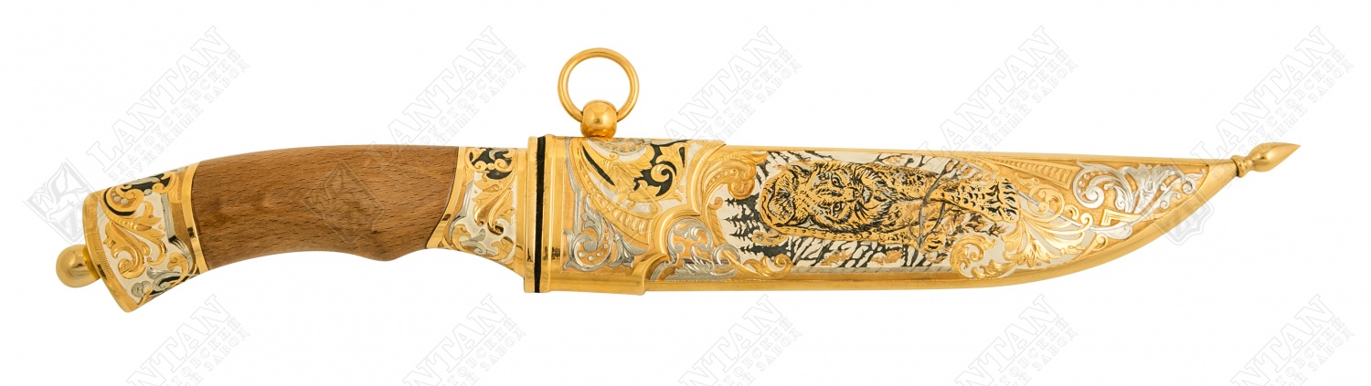 Нож цм "бланк-рысь" из нержавеющей стали 40х10с2м(эи-107) (закал. Материал: клинок из стали ЭИ-107 (закалка 55 ед. по шкале Роквелла); ножны из латуни; рукоять из граба. Покрытие: золотом 999,9; серебром 925; никелем. Техника исполнения: токарные и слесарные работы, рисовка кистью на металле, многоступенчатая гравировка иглой по лаку, травление, ручная подрезка, полировка, чернение латуни. Изысканный и неповторимый – нож ручной работы из нержавеющей стали «Бланк-Рысь». Это эксклюзивное, коллекционное изделие. Имеет прочный стальной клинок, латунные ножны и грабовую рукоять. Декорирован различными узорами, на ножнах изображение рыси. Имеет золотое, серебряное и никелевое покрытие. Станет прекрасным подарком для смелых и уверенных мужчин. Размеры: общая длина - 340 мм длина клинка - 170 мм ширина клинка - 30 мм ? ×сталь Тип стали Кованая нержавеющая 40Х10С2М(ЭИ-107) Покрытие Гальванический метод