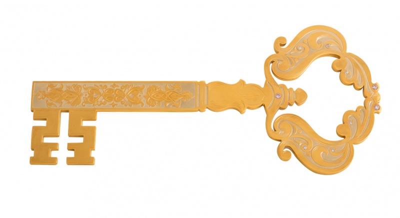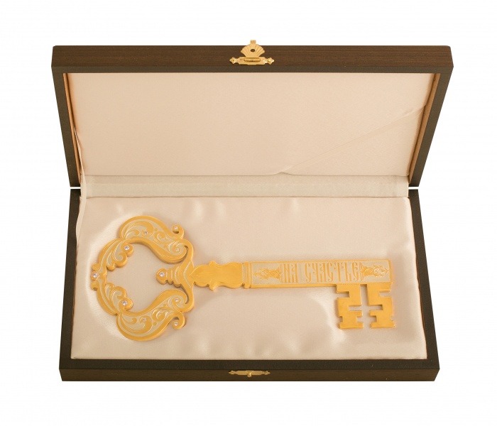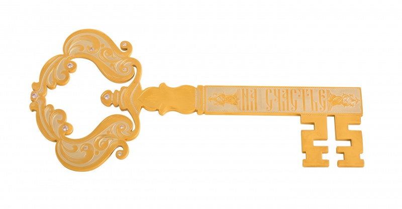 Ключ символический "на счастье" златоуст. Материал: латунь; инкрустация ювелирными камнями. Покрытие: золотом 999,9; никелем. Техника исполнения: токарные и слесарные работы, рисовка кистью на металле, многоступенчатая гравировка иглой по лаку, травление, ручная подрезка, полировка. Ключ "Символический" можно преподнести новому начальнику или партнеру по бизнесу. Размеры: длинна - 240 мм. ширина - 120 мм. толщина - 5 мм.