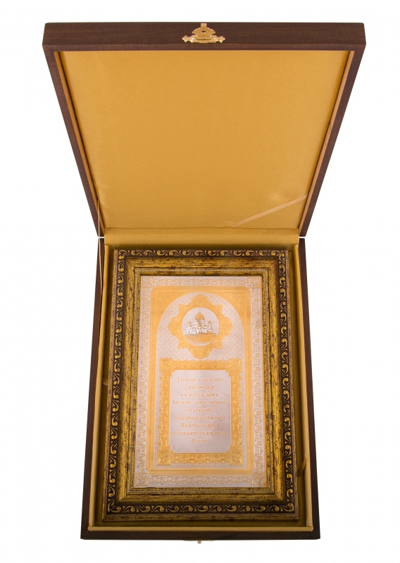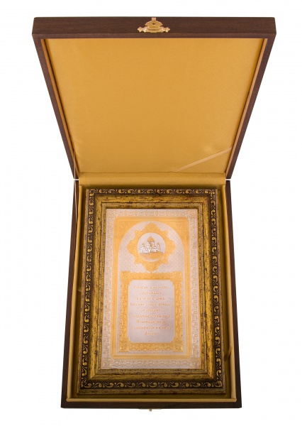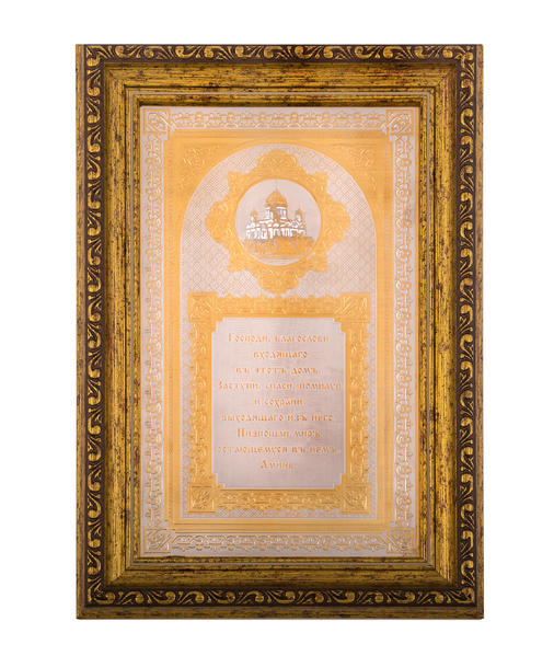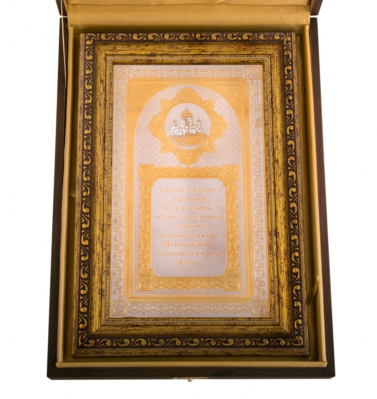 Панно-оберег "мир дому" (храм) от златоустовский оружейный заво. Материал: латунь. Покрытие: золотом 999,9; никелем. Техника исполнения: слесарные работы, рисовка кистью на металле, многоступенчатая гравировка иглой по лаку, травление, полировка. Оригинальным и, несомненно, дорогим подарком для молодой семьи на годовщину будет панно-оберег «Мир дому». Православный Храм, изображен на панно, был нанесен путем нанесения сложной многоступенчатой гравировки. Само панно выполнено из латуни с золотым и никелевым покрытием. Кроме того, оно украшено красивым орнаментом и словами молитвы. Такой подарок станет символом спокойной обстановки и мира в семье. Размеры: Ширина - 205 мм. Высота - 300 мм. Покрытие Гальванический метод