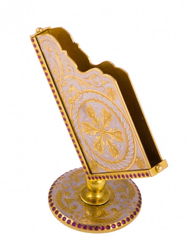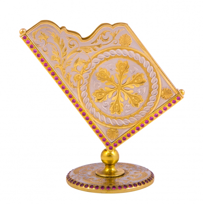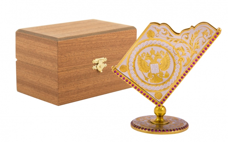Визитница настольная "стиль" герб рф златоуст. Материал: латунь, фианит. Покрытие: золотом 999,9; никелем. Техника исполнения: токарные и слесарные работы, рисовка кистью на металле, многоступенчатая гравировка иглой по лаку, травление, ручная подрезка, полировка. Для достойного и уникального подарка замечательно подойдет настольная визитница «Стиль» с изображением герба Российской Федерации. Этот классический дизайн создаст атмосферу уюта и современности рабочего кабинета или офиса. Изготовлена она из латуни. Ее презентабельный вид подчеркивает покрытие из золота. А инкрустация розовыми фианитами придает непревзойденное чувство роскоши и изящества. Размеры: ширина - 110 мм. высота - 110 мм. Покрытие Гальванический метод