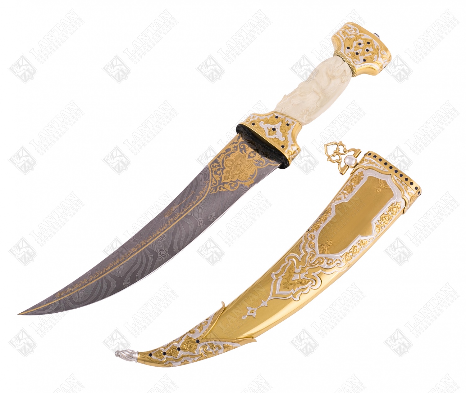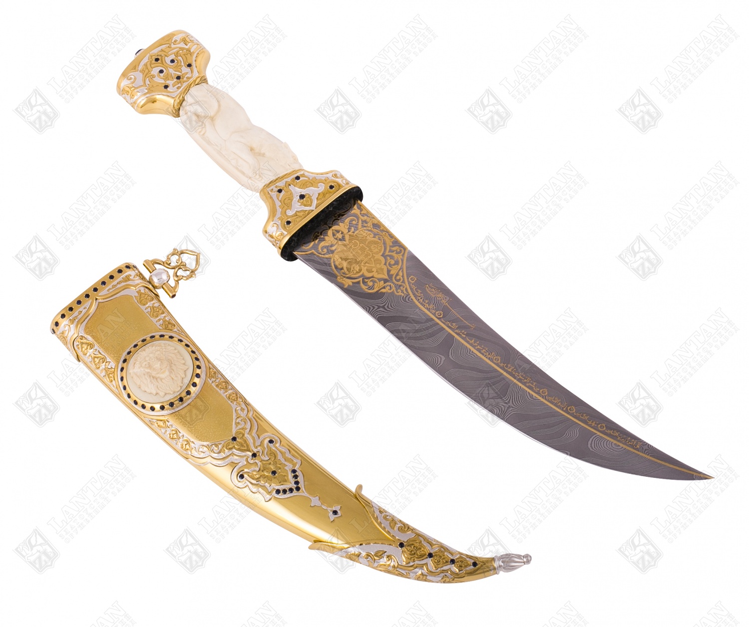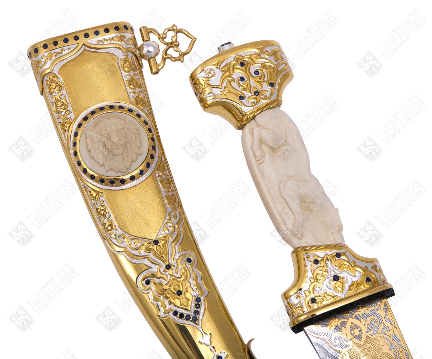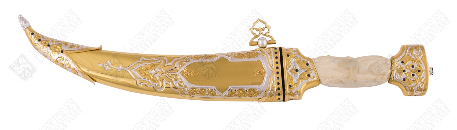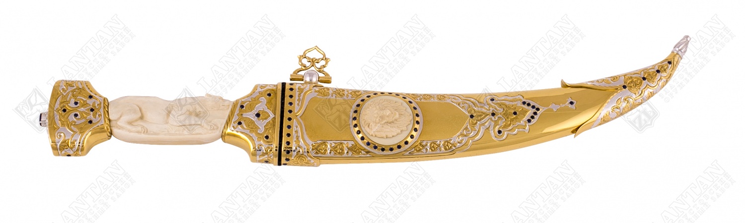 Эксклюзивный нож цм "львица" из серебра и дамасcкой стали (закал. Материал: клинок из дамасcкой стали (закалка 58-62 ед. по шкале Роквелла); ножны и вставки на рукояти из серебра 925 пробы; рукоять из бивня мамонта; ножна с вставками изображения львицы из бивня мамонта; инкрустация ювелирными камнями. Покрытие: золотом 999,9; никелем. Техника исполнения: художественное выпиловка, токарные и слесарные работы, рисовка кистью на металле, 3D-моделирование станочной обработки, ювелирное дело, травление, ручная подрезка, полировка. Эксклюзивный и роскошный нож «Львица» изготовлен из серебра, дамасской стали и бивня мамонта. Нож инкрустирован ювелирными камнями черного цвета. Ножны декорированы орнаментом и 3D изображением львицы, выполненного также из бивня мамонта. Это дорогое изделие ручной работы станет отличным подарком для солидных VIP-персон. Считается, что изделие из бивня мамонта наделяет своего обладателя здоровьем и долголетием, служат настоящим талисманом. Размер: общая длина - 340 мм длина клинка - 185 мм ширина клинка - 40 мм ? ×сталь Тип стали Кованая дамасская Покрытие Гальванический метод