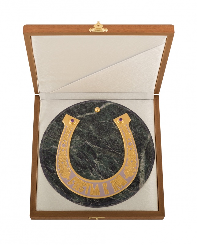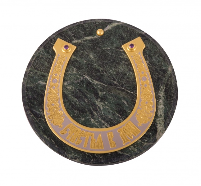 Сувенир "подкова на счастье" из змеевика златоуст. Материал: латунь, змеевик, фианит. Покрытие: золотом 999,9; никелем. Техника исполнения: токарные и слесарные работы, рисовка кистью на металле, многоступенчатая гравировка иглой по лаку, травление, ручная подрезка, полировка. Сувенир «Подкова на счастье» из змеевика и латуни, станет эксклюзивным и дорогим подарком молодоженам на свадьбу или символическим презентом на новоселье или годовщину. Уникальная подкова ручной работы покрыта золотом и никелем, её украшает символическая надпись «Счастья в дом» и фианиты фиолетового оттенка. Такой сувенир станет любимым оберегом домашнего уюта. Размеры: диаметр 150 мм. Покрытие Гальванический метод