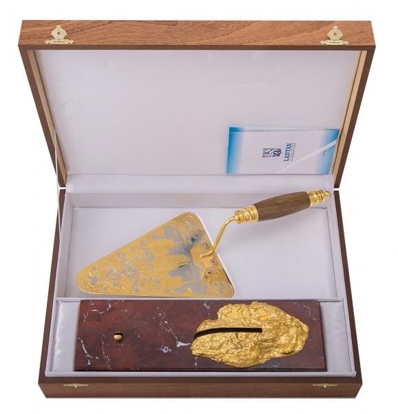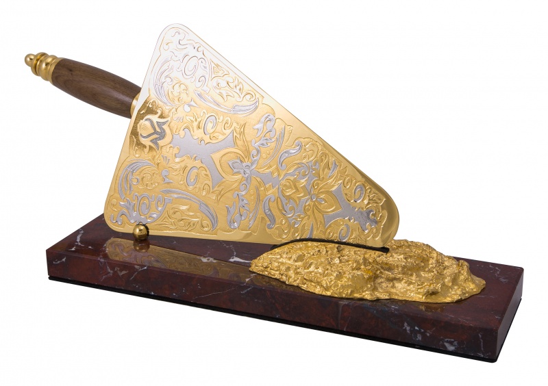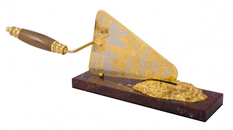 Сувенир "мастерок" на подставке (яшма) златоуст. Материал: латунь, натуральный камень - яшма. Покрытие: золотом 999,9; никелем. Техника исполнения: токарные и слесарные работы, рисовка кистью на металле, многоступенчатая гравировка иглой по лаку, травление, ручная подрезка, полировка. Сувенир на подставке «Мастерок» - это эксклюзивное изделие ручной работы, выполненное из латуни и яшмы, с золотым и никелевым покрытием. Мастерок украшает сложная многогранная гравировка в виде орнамента и изображение высотных зданий в процессе стройки. Такой подарок станет прекрасным презентом для строителя на профессиональный праздник. Он подчеркнет статус в обществе и отлично впишется в любой рабочий интерьер. Размеры: подставка: длина 300 мм. ширина 90 мм. мастерок: высота 360 мм. ширина 90 мм. Покрытие Гальванический метод