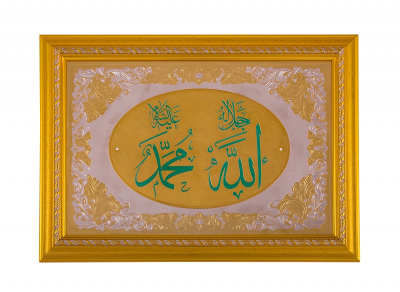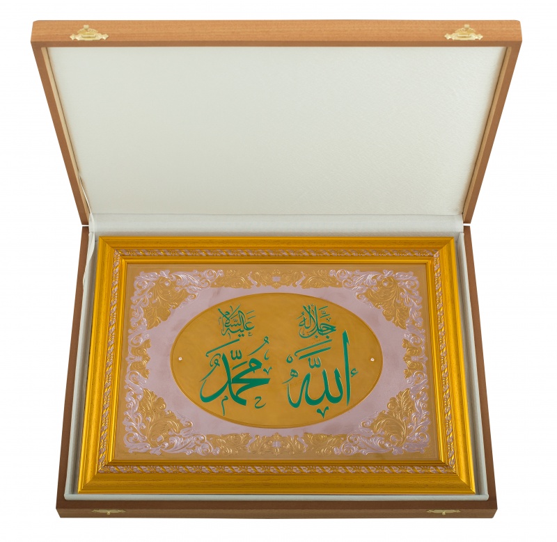 Панно-оберег "аллах и мухаммед" от златоустовский оружейный зав. Материал: латунь, эмаль, фианит. Покрытие: золотом 999,9; никелем. Техника исполнения: слесарные работы, рисовка кистью на металле, многоступенчатая гравировка иглой по лаку, травление, полировка. Панно-оберег «Аллах-Мухаммед» станет прекрасным религиозным подарком для друга или начальника-мусульманина. Оно изготовлено из латуни, покрытое золотом и никелем. Панно дополнительно украшено ювелирными камнями и эмалью. Такое панно будет служить отличным оберегом как в домашней обстановке, так и в рабочей. Панно выполнено вручную лучшими мастерами своего дела. Размеры: Ширина - 340 мм. Высота - 240 мм. Покрытие Гальванический метод