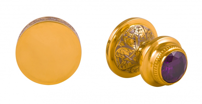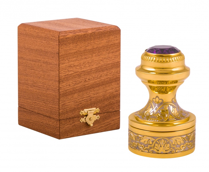 Печать большая с фианитом "богатство" (лаванда) исполнение 2 зл. Материал: латунь, фианит,. Покрытие: золотом 999,9; никелем. Техника исполнения: токарные и слесарные работы, рисовка кистью на металле, многоступенчатая гравировка иглой по лаку, травление, ручная подрезка, полировка. Печать «Богатство» в виде презента поможет сыграть на руку ее дарителю, так как полученные положительные эмоции надолго останутся в памяти у оппонента. Эксклюзивное гравированное изделие с большим фианитом станет любимым аксессуаром на столе начальства, которым можно гордиться и бесконечно восхищаться. Печать изготовлена из латуни с золотым и никелевым покрытием и с нанесением уникального орнамента. Размеры: Высота: 80 мм. Ширина: 50 мм. Покрытие Гальванический метод