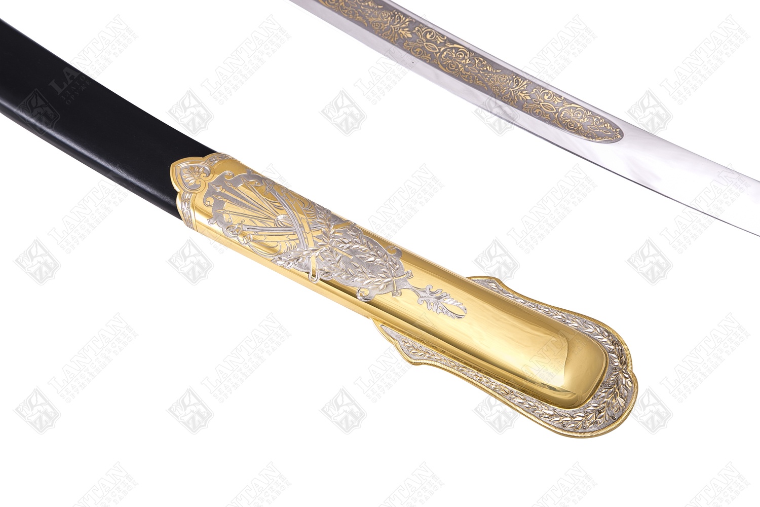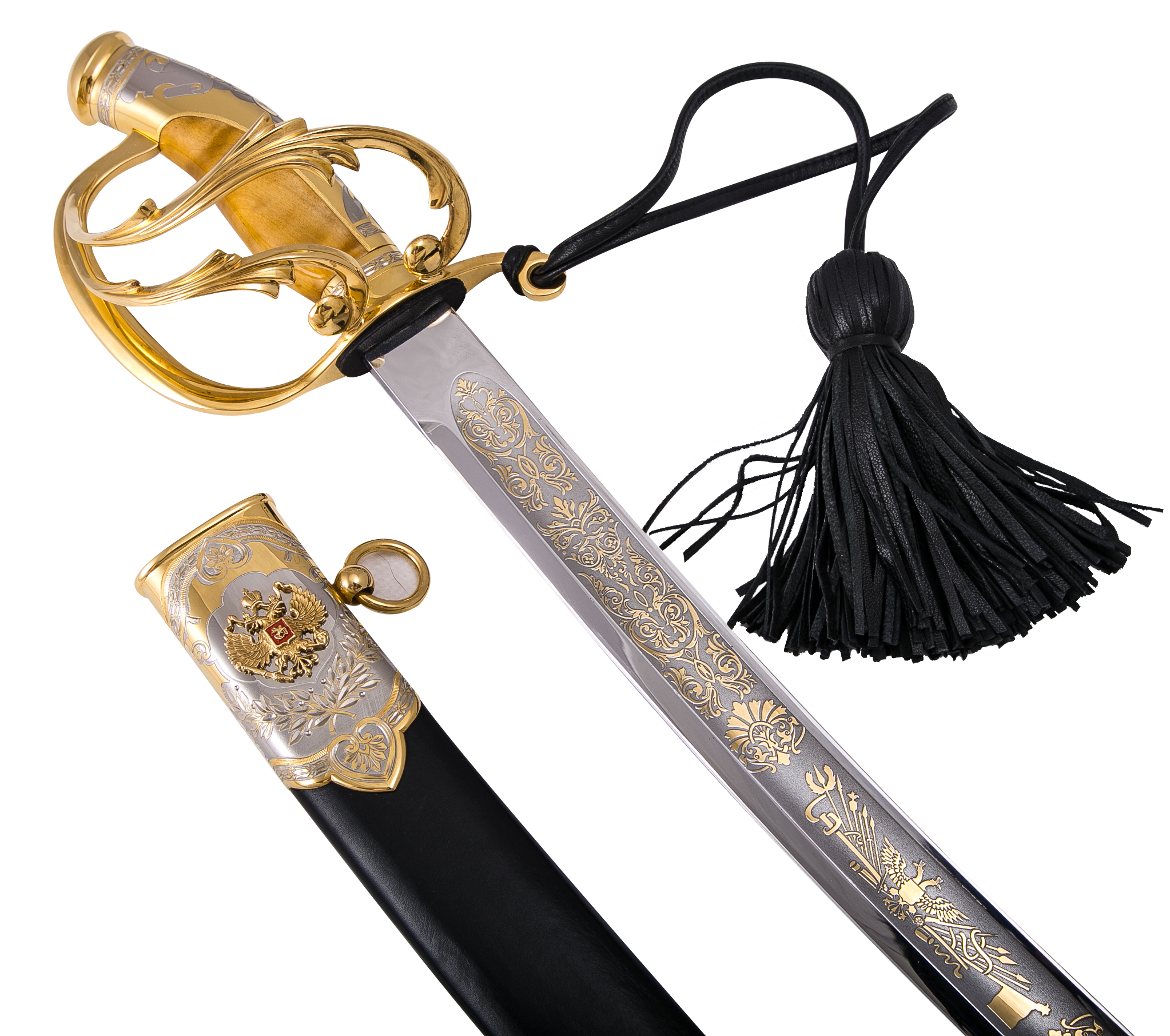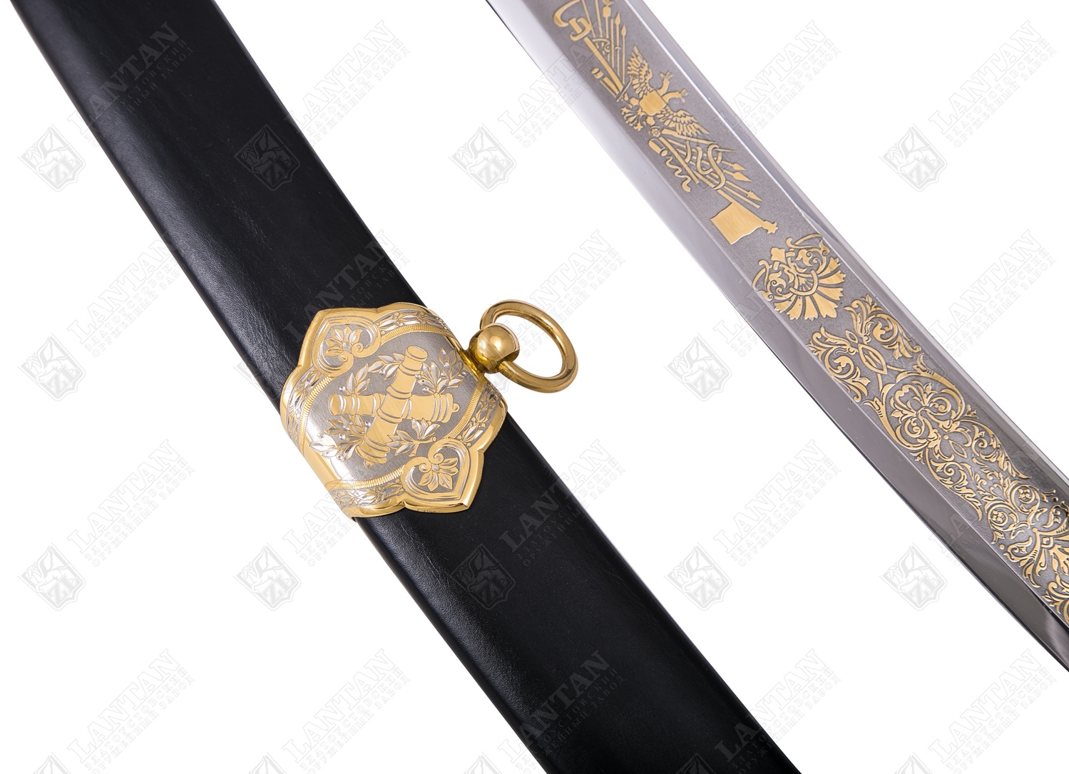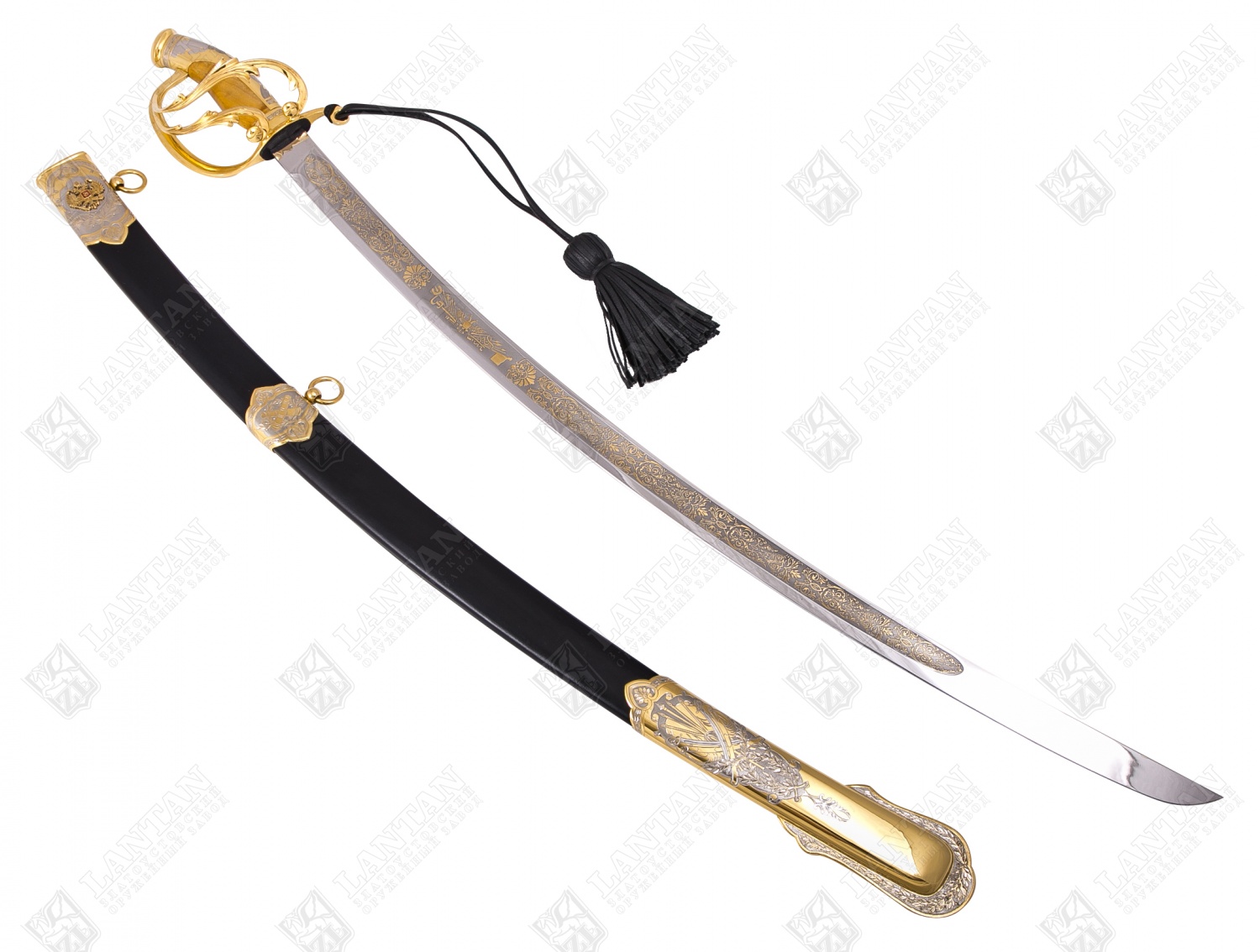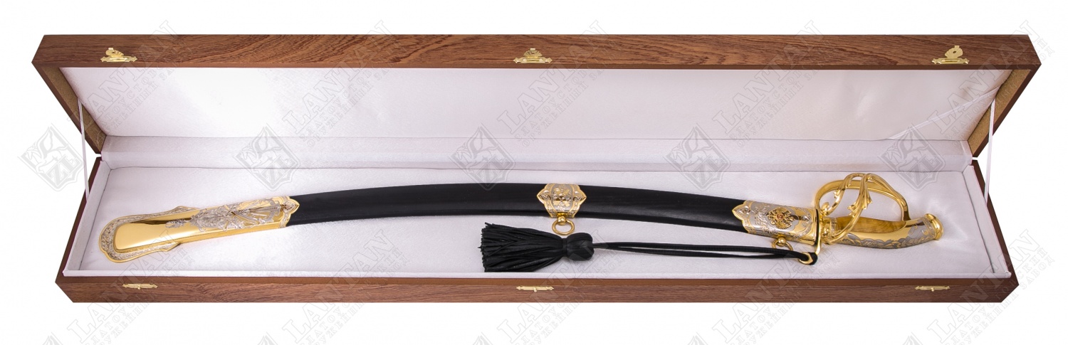 Сабля "гвардейская" с символикой рф из нержавеющей стали 40х10с2. Материал: клинок из стали ЭИ-107 (закалка 55 ед. по шкале Роквелла); ножны из латуни вставки кожи; рукоять из ценных пород дерева. Покрытие: золотом 999,9; никелем. Техника исполнения: токарные и слесарные работы, рисовка кистью на металле, многоступенчатая гравировка иглой по лаку, травление, ручная подрезка, полировка. Изделие украшено стилизованным растительным орнаментом и военной символикой. На ножнах и на тыльнике Герб Российской Федерации , на клинке запечатлен фрагмент Отечественной войне 1812 года, принесшего одну из славных побед. Чтобы сделать эксклюзивный VIP-подарок мужчине, стоит купить саблю «Гвардейская» с символикой РФ, изготовленной вручную на Златоустовском заводе с соблюдением всех уникальных технологий оружейного искусства. Ножны оригинальной сабли выполнены из латуни со вставками натуральной кожи, рукоять – из дорогих древесных пород, а стальной клинок покрыт позолотой. Размеры: общая длина 1020 мм длина клинка 825 мм ширина клинка 31 мм ? ×сталь Тип стали Кованая нержавеющая 40Х10С2М(ЭИ-107) Покрытие Гальванический метод