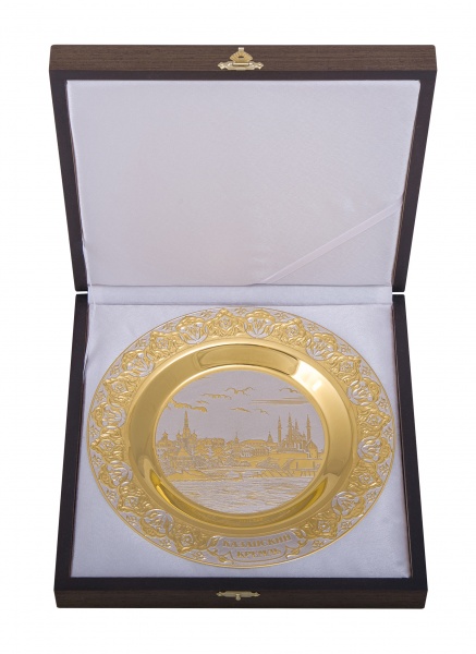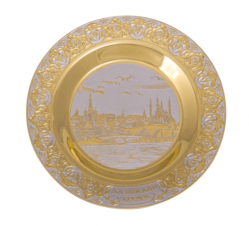 Тарель "казанский кремль" гравюра ( диаметр 190мм.) златоуст. Материал: латунь. Покрытие: золотом 999,9; никелем. Техника исполнения: токарные и слесарные работы, рисовка кистью на металле, многоступенчатая гравировка иглой по лаку, травление, ручная подрезка, полировка. Тарель «Казанский Кремль», покрытая позолотой и украшенная многоступенчатой гравировкой, станет отличным памятным подарком для гостей, побывавших в Татарской республике, и роскошным украшением интерьера. Уникальный рисунок с чернением в виде главной крепости города выполнен по авторским эскизам и придает изделию особенный внешний вид. Размеры: диаметр -190 мм Покрытие Гальванический метод
