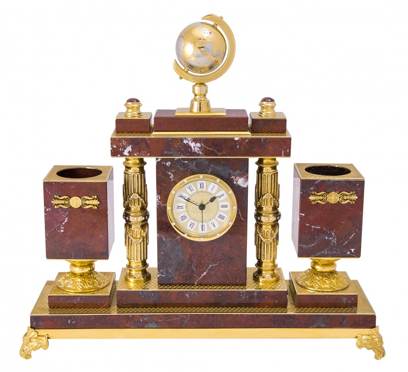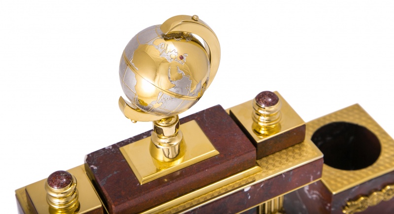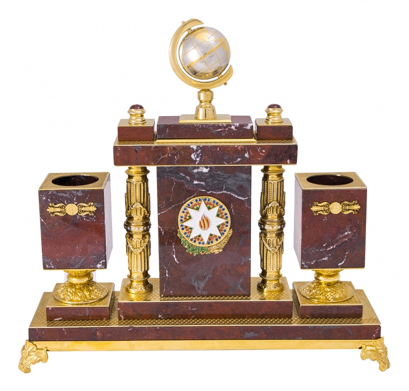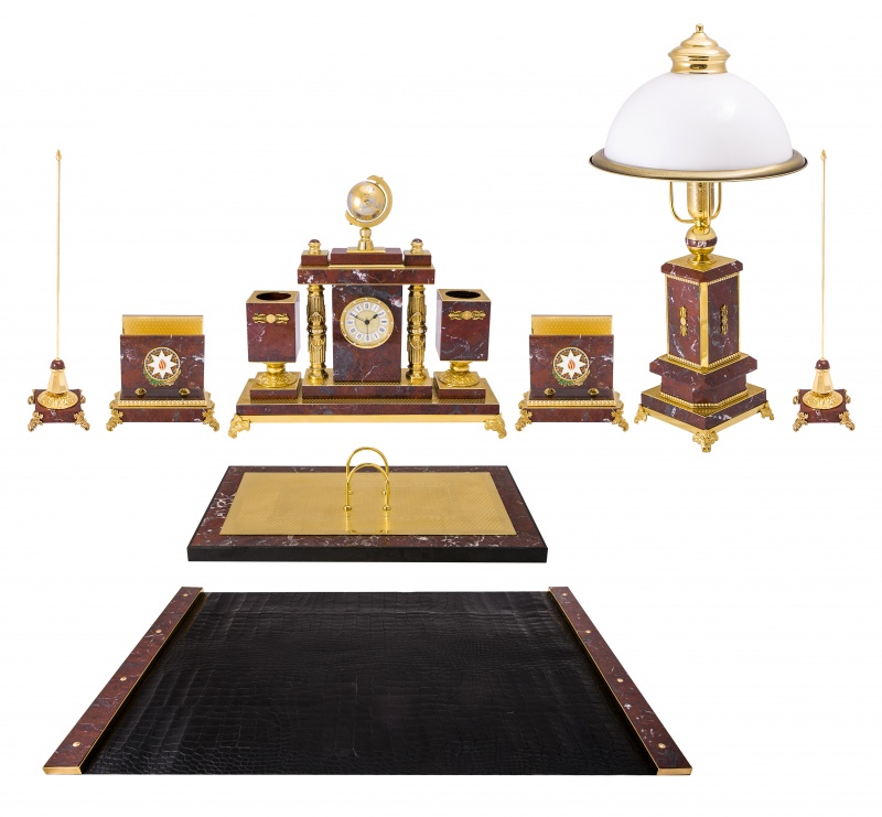 Письменный набор "президентский" из яшмы. Материал: камень яшма; латунь, эмаль; гербы из латуни; натуральная кожа; инкрустация ювелирными камнями. Покрытия: золотом 999,9; никелем. Техникая исполнения: токарные и слесарные работы, рисовка кистью на металле, многоступенчатая гравировка иглой по лаку, травление, ручная подрезка, полировка. Изделия изготовлены из природных материалов высокого качества. Тщательная проработка деталей характеризует безупречную работу мастера. Изделие станет изысканным статусным подарком для VIP персоны, великолепно впишется в богатый интерьер дома или рабочего кабинета. Возможно изготовление по индивидуальным эскизам с нанесением корпоративной символики. Покрытие Гальванический метод