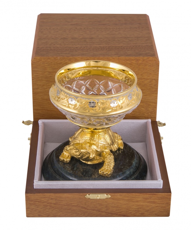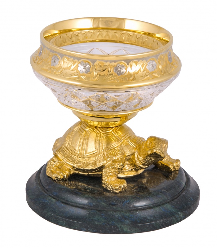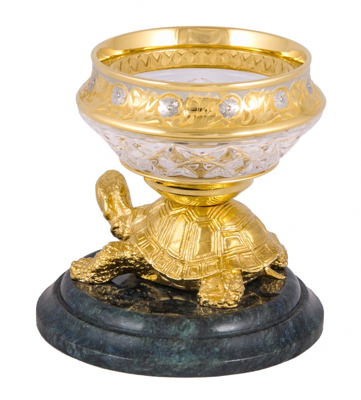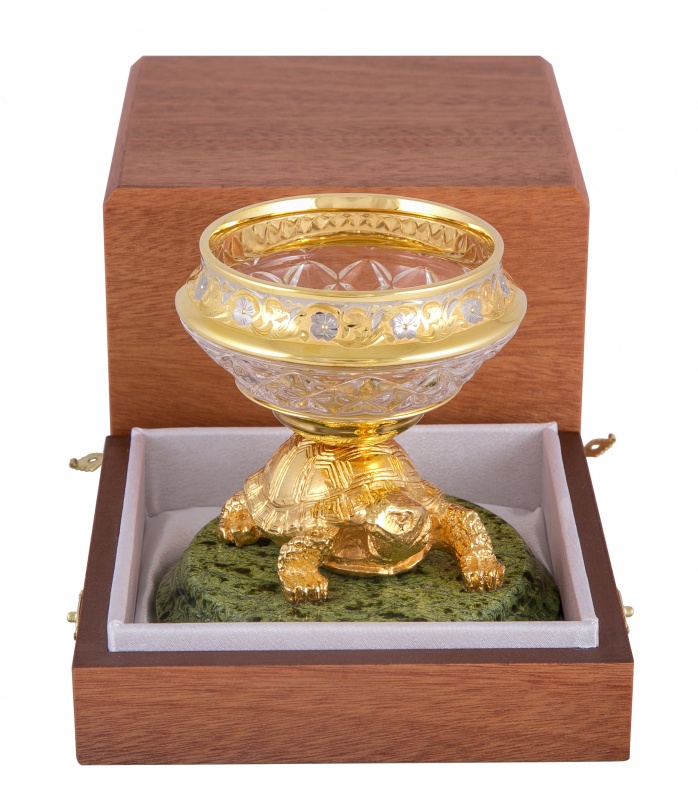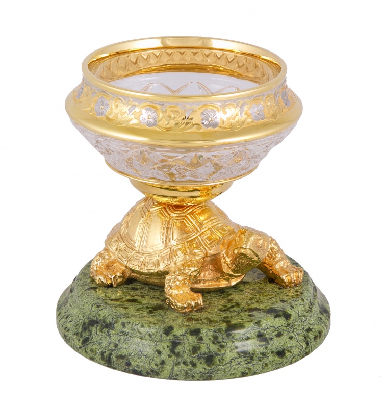 Конфетница "черепаха". Материал: латунь, поделочный камень, хрусталь. Покрытие: золотом 999,9; никелем. Техника исполнения: художественное литье, токарные и слесарные работы, рисовка кистью на металле, многоступенчатая гравировка иглой по лаку, травление, ручная подрезка, полировка. Отличный подарок для всех любителей сладостей – лаконичная конфетница из латуни и хрусталя. Изделие имеет весьма необычную форму - основанием композиции служит черепаха, на панцире которой и покоится чаша для любимого лакомства. Такой подарок имеет практическое и эстетическое значение, а также отлично подойдет для оформления любого интерьера. Размеры: ширина - 115 мм. высота - 210 мм. Покрытие Гальванический метод