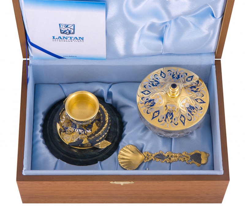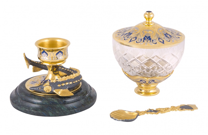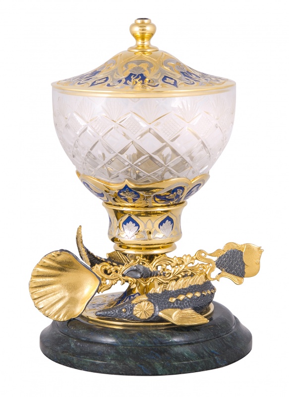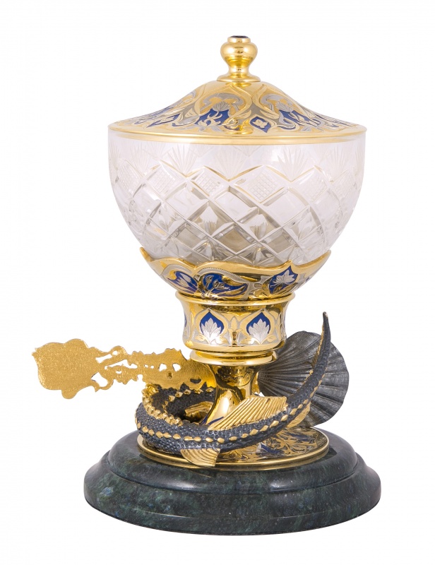 Икорница "черноморский осётр" (змеевик) златоуст. Материал: латунь, змеевик, хрусталь, эмаль. Покрытие: золотом 999,9; серебром 925; никелем. Техника исполнения: художественное литье, токарные и слесарные работы, рисовка кистью на металле, многоступенчатая гравировка иглой по лаку, травление, ручная подрезка, полировка. Такой деликатес, как икру, обязательно нужно подавать в достойной посуде, подчеркивающей всю изысканность яства. Икорница «Черноморский осетр» - это умелое сочетание латуни, хрусталя и змеевика, приобретающих в умелых руках Златоустовских мастеров совершенные формы. В комплекте с основным изделием идет и специальная ложечка, отчеканенная вручную. Размеры: ширина - 110 мм. высота - 190 мм. Покрытие Гальванический метод