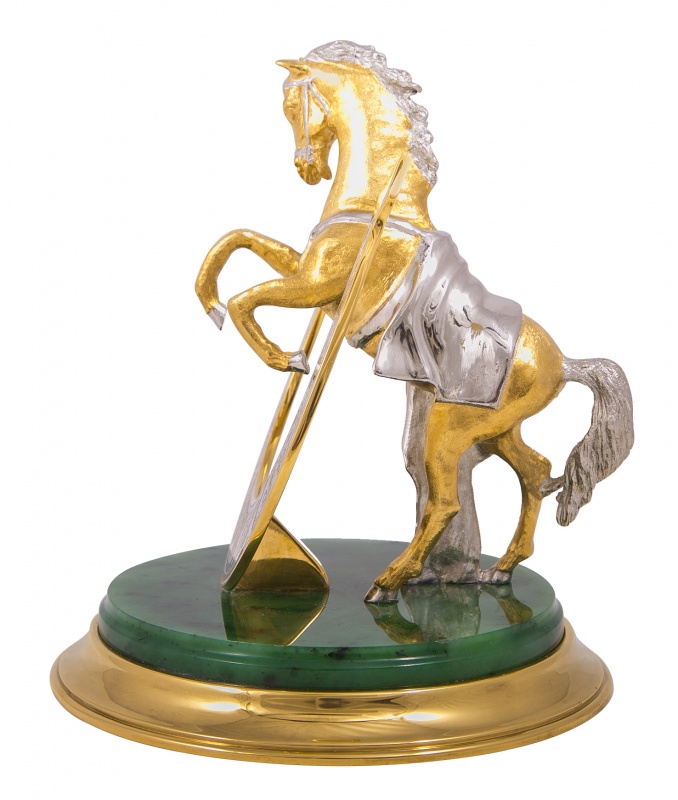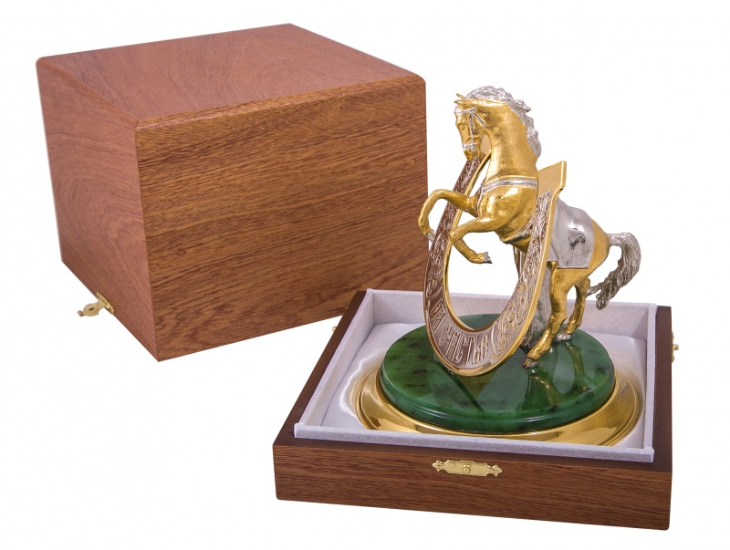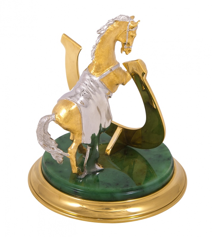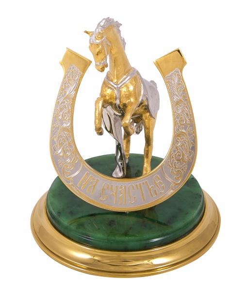 Сувенир "подкова с конем "на счастье" из нефрита златоуст. Материал: латунь, нефрит. Покрытие: золотом 999,9; никелем. Техника исполнения: токарные и слесарные работы, рисовка кистью на металле, многоступенчатая гравировка иглой по лаку, травление, ручная подрезка, полировка. Универсальный подарок для ценителей искусства самых разных возрастов. Сам сувенир в виде подковы и наскакивающего на нее коня выполняется из латуни с золотым и никелевым покрытием, вручную декорируется вензелями. Основание же изготовлено из натурального уральского камня нефрит. Сувенир упакован в подарочной коробке. Размеры: Высота - 175 мм. Ширина - 140 мм. Покрытие Гальванический метод