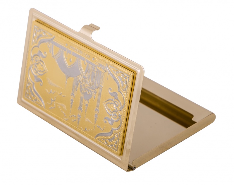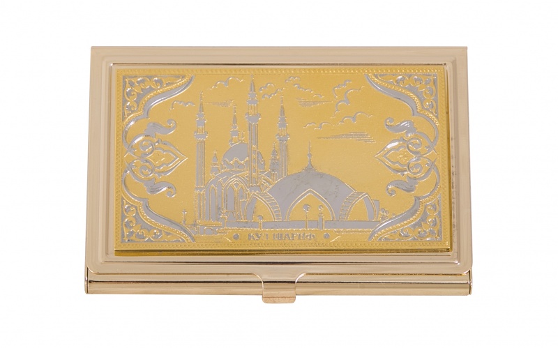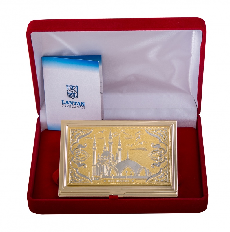 Визитница карманная "кул-шариф". Материал: латунь. Покрытие: золотом 999,9; никелем. Техника исполнения: токарные и слесарные работы, рисовка кистью на металле, многоступенчатая гравировка иглой по лаку, травление, ручная подрезка, полировка. Карманная визитница "Кул-Шариф" – неотъемлемый атрибут образа любого делового человека, а вот латунная композиция такого типа ручной работы может смело говорить о высоком статусе своего владельца. Подобный подарок наверняка понравится гостю из Казани, ведь на лицевой стороне визитницы изображен именно этот исторически важный населенный пункт с богатой историей. Размеры: длина - 9,5 см ширина - 6,3 см толщина - 0,8 см Покрытие Гальванический метод