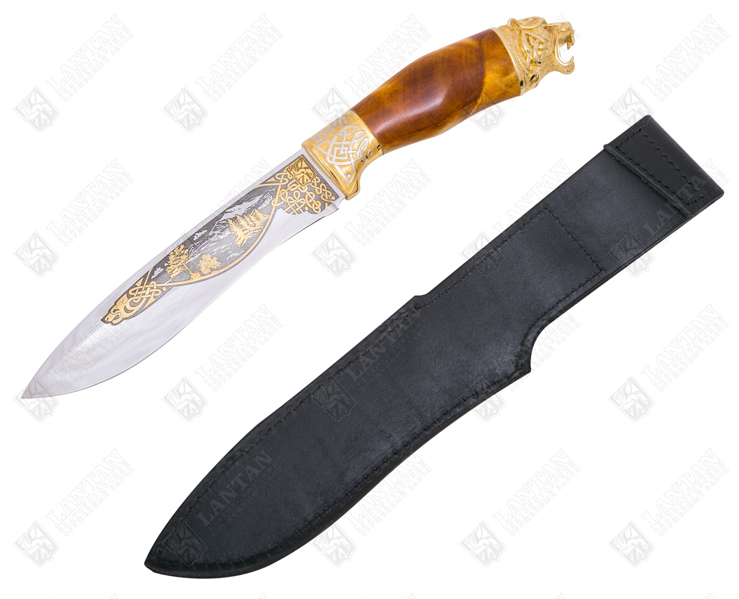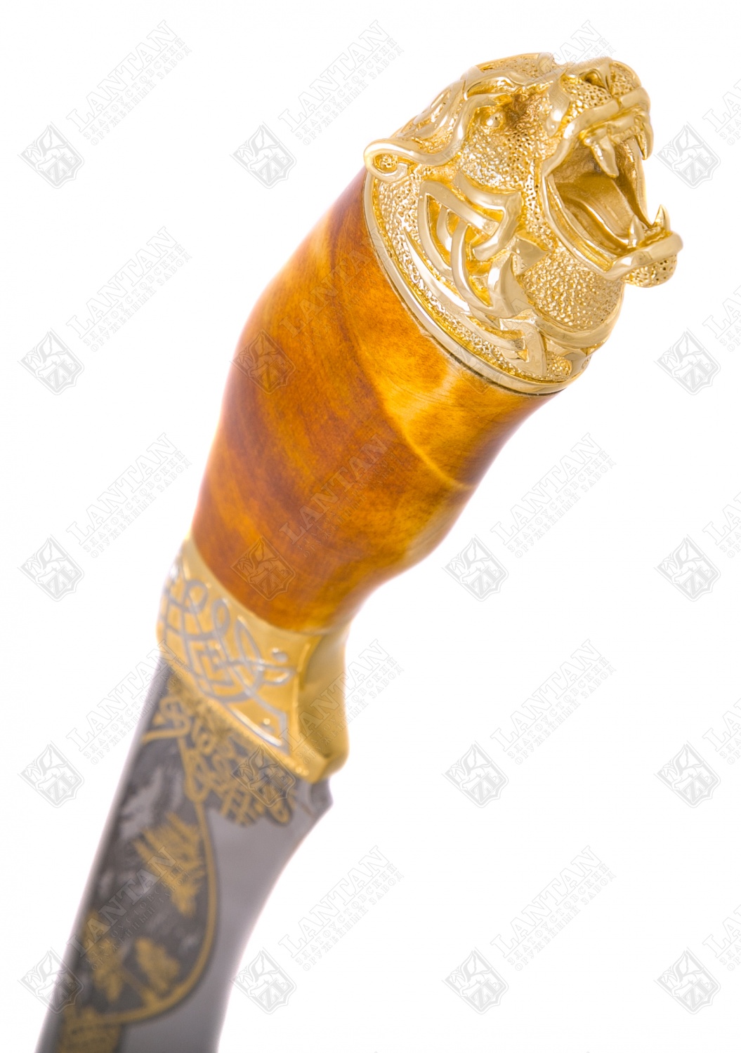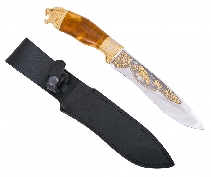Нож "блейз - тигр" из нержавеющей стали 40х10с2м(эи-107) (закалк. Материал: клинок из стали ЭИ-107 (закалка 55 ед. по шкале Роквелла); рукоять из ореха с латунными вставками; кожаные ножны. Покрытие: золотом 999,9; никелем. Техника исполнения: токарные и слесарные работы, рисовка кистью на металле, многоступенчатая гравировка иглой по лаку, травление, ручная подрезка, полировка. Настоящий охотничий нож со стальным клинком представляет собой достойный подарок для коллекционеров и любителей холодного оружия. Рукоять из древесины ореха украшается объемной фигурой головы тигра и расписными латунными вставками. Непосредственно клинок вручную украшается орнаментом и тематическим изображением тигра, перекликающимся с фигурой на рукояти. Завершением концепции являются кожаные ножны, в которых изделие и предлагается покупателям. Размеры: общая длина - 320 мм длина клинка - 175 мм ширина клинка - 35 мм ? ×сталь Тип стали Кованая нержавеющая 40Х10С2М(ЭИ-107) Покрытие Гальванический метод